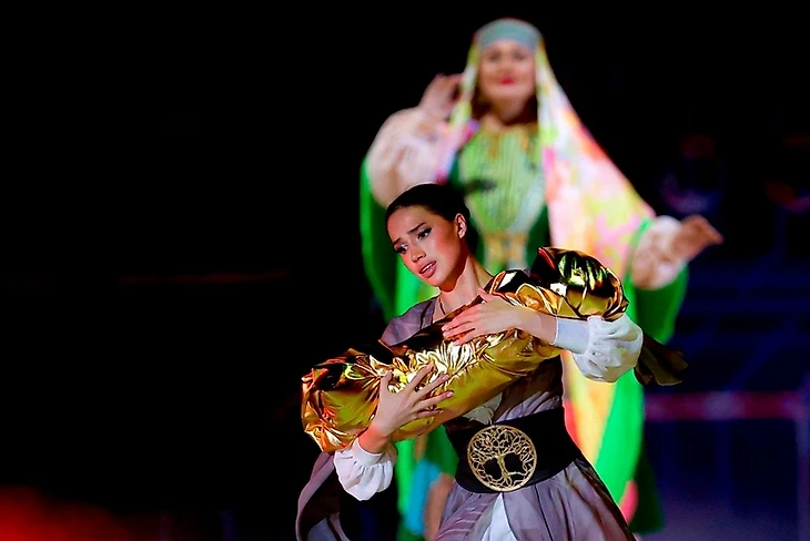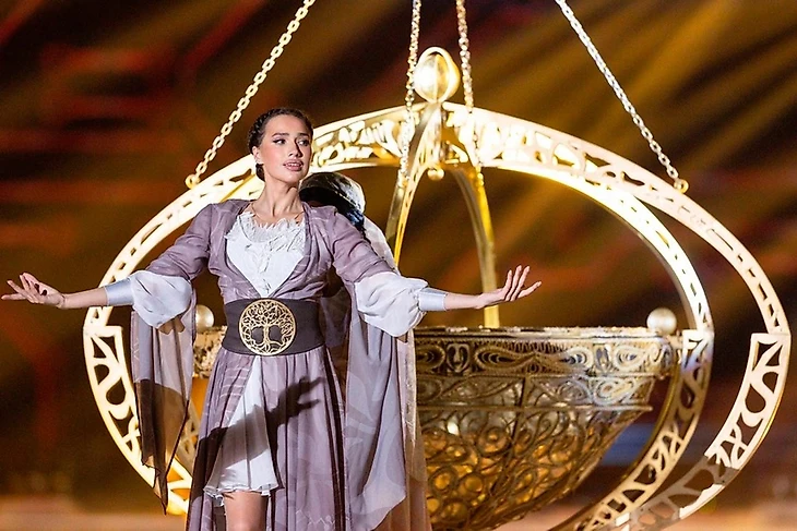 Сказительница переносит нас на просторы обширной Великой Степи по которой издревле расселились племена, которые сегодня называют тюркскими. Согласно верованиям степняков, всё подчиняется главному, верховному божеству Тенгри – Великому синему Небу, который создал Мир и установил Закон – порядок существования всего сотворённого. «...Когда-то не было ни земли, ни неба, а был только один необъятный океан. Однажды внутри океана возник Белый Свет, из которого образовалось сияющее золотое яйцо. Внутри него спал бог Тенгри – прародитель всего Мира. Он спал очень долго, миллионы и миллионы лет, и вот однажды проснулся. Тенгри разбил скорлупу яйца и вышел наружу. Из верхней части яйца Тенгри сотворил Небо, а из нижней сделал Землю» - так рассказывает один из древнетюркских мифов о появлении Тенгри и рождении мира. « Древние тюрки, наблюдая за природой, видели, что большая часть вещей в мире имеет двойственную природу, как две стороны одной медали: без тьмы нет света, без ночи – дня, добро противостоит злу, горе сменяет радость, за жизнью наступает смерть... Поэтому и у Тенгри – олицетворяющего мужское, созидательное начало, есть «оборотная сторона», уравновешивающая мироздание. Это богиня-мать Умай (Хумай, Ымай, Этүгэн, иногда Умайя), которая, практически, неразделима с Тенгри. Если верховный бог – это чистое, совершенное Небо, то олицетворением Умай является плодоносящая Земля. Супруга Тенгри - покровительница женщин, особенно заботится она о тех, кто вскоре должен стать матерью, помогает им во время родов, а после – оберегает их детей от различных бед и несчастий. Богиня сходила в мир людей по радуге,волосы у нее были сотканы из лунного света, а руки сияли подобно дневному солнцу. Делала она это, чтобы уничтожать из своего лука злых духов Эрлика – правителя смерти и подземного царства как покровительница всего живого».О.Жанайдаров. Вера в Тенгри и Умай оказывала огромное влияние на все сферы жизни древних тюрков. Она формировала их мировоззрение, этические нормы и моральные ценности: *почитание природы: Тенгри и Умай, как воплощения небесных и земных сил, учили людей жить в гармонии с природой, уважать ее законы и беречь ее дары; *семейные ценности: Культ Умай способствовал укреплению семейных уз, подчеркивал важность материнства, отцовства и заботы о детях; *гостеприимство: тюрки верили, что гость — это посланник Тенгри, поэтому принимали его с особым почтением и уважением; *справедливость и честность: Тенгри считался богом справедливости, поэтому люди стремились жить по совести, не нарушать законы и чтить традиции предков. Согласно старинной традиции, сохранившейся до сегодняшнего дня у тюрков, каждый должен знать своих предков до седьмого колена, хранить память о них и их деяниях. Это очень ценно с этической точки зрения – каждый живущий, в таком случае, должен думать о том, какая память останется потомкам после его смерти на много поколений вперед. На эти важные установки в спектакле делается большой упор, как на основу залога счастливой жизни будущих поколений. На фоне завораживающего рассказа Сказительницы на льду начинается настоящая магия - в воздухе появляются светлячки, которые танцуя перестраиваются в движущиеся сферы, незримо для глаз управляя часами Вечности и в завершение круговорота принимают форму гигантских крыльев.