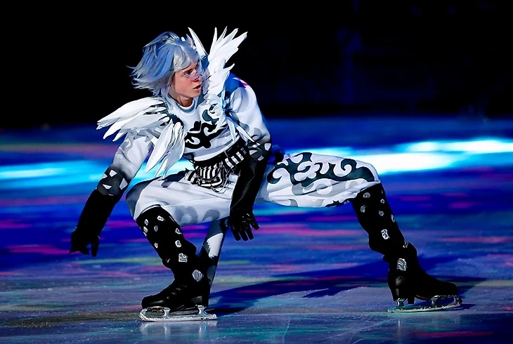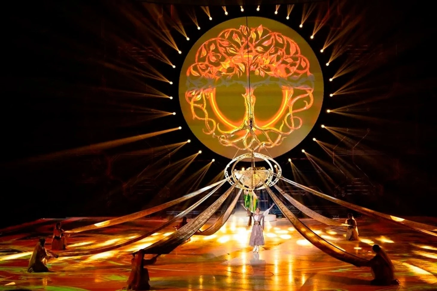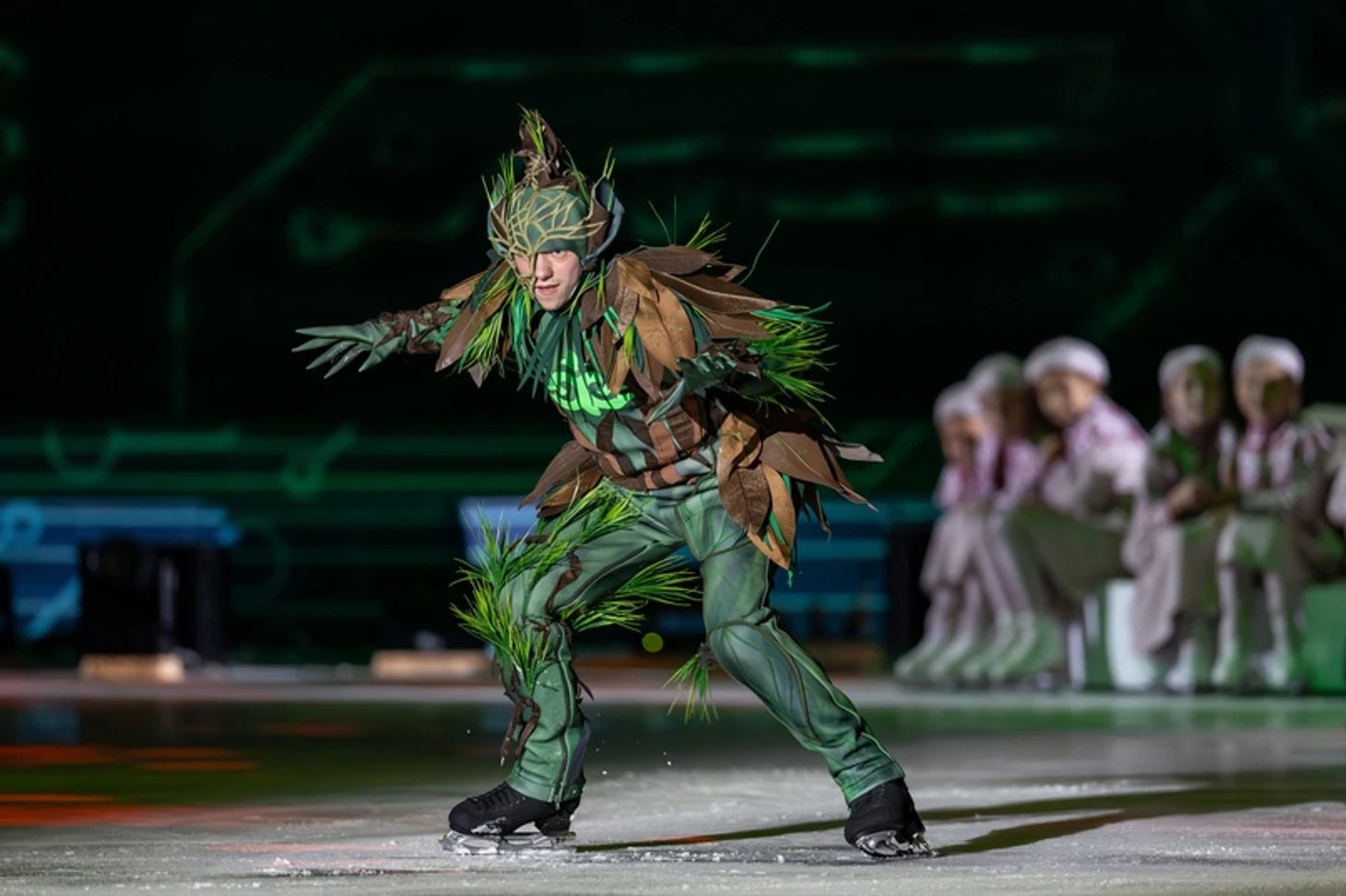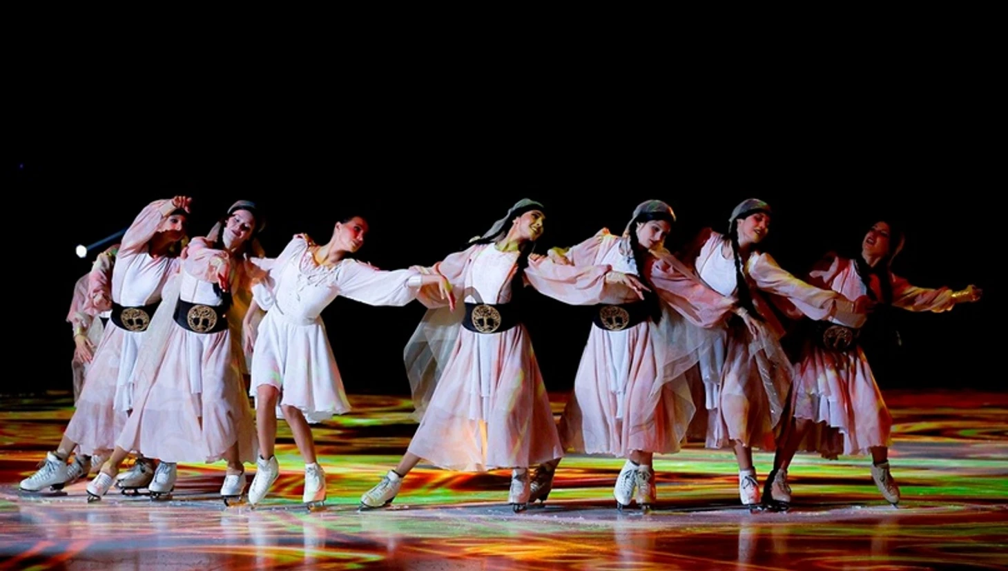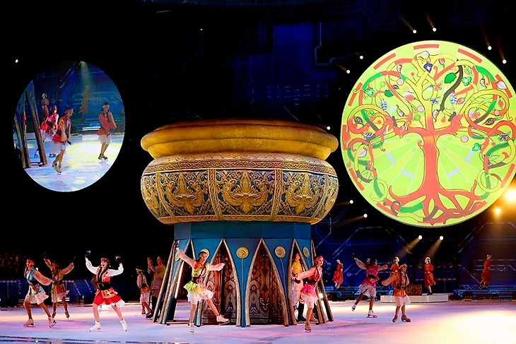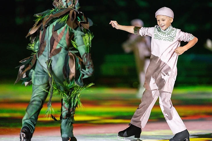 Это необыкновенно красивое зрелище было похоже на чарующую симфонию, неуловимую для слуха, но чувствительную для сердца и заставило зрителей замереть с восхищением. Никогда еще световой эффект не использовался на ледовом шоу с такой волшебной, завораживающей выразительностью для создания дивного, красивого мира, в котором обитают удивительные создания. Светлячки – необычные обитатели мира Духов, состоящие из света. По древним преданиям, если вы ищете что-то в мире Духов, то, следуя за ними, можете попасть туда, куда вам нужно. Возникший из воздуха огненный вихрь открывает следующее окно в древность. На льду проступают узоры с элементами национальной самобытности, а танец девушек повторяет их, вырисовывая кружевные фигурные па на льду. На двух круглых экранах бегут кадры, словно из кинопленки, отражая значимые моменты своего времени. В центре большого круга Древо Жизни - наиболее часто встречающийся мотив в искусстве тюркских народов, которое ценится как мифологическая модель мира, воплощающая в себе структурные уровни времени и пространства.