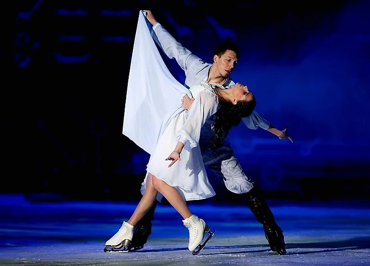 Эти сцены с участием детей настолько трогательны, проникновенны и чисты, что без слез умиления никак не обойтись– маленькие ледовые артисты изумительно органично вписываются в сказание, так непосредственно, по-настоящему проживая на льду свои роли. На льду они были так искренни, что, казалось и сами верили в то, что все происходит по-настоящему. Тем временем, колесо времени не перестает крутиться, оставляя за стрелками дела минувших лет. Танец-молитва должна связать нити времени дальше, оберегая накопленные знания и мудрость для следующих поколений. В центре танца белый платок, который оживает в руках грациозной Алины и чуткого и заботливого Дмитрия , создавая неуловимую магию в воздухе, и начинает звучать как молитва. Их плавные движения очаровывают зрителя пронзительной нежностью, трепетным отношением друг к другу, желанием укрыть, защитить, уберечь и сохранить хрупкий мир.