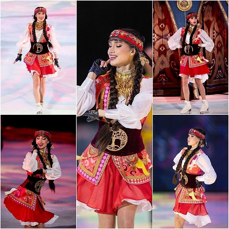 Начинается татарский перепляс вокруг невесты с женихом под известную песню «Бас, кызым, Апипэ». Очень интересно смотрится интерпретация задорного татарского танца, перенесенного с партера на лед. Хочется сказать «браво» хореографу и исполнителям за национальный колорит. Характерные движения зажигательного народного танца буквально расплавили лед, сорвав горячие аплодисменты зрителей.