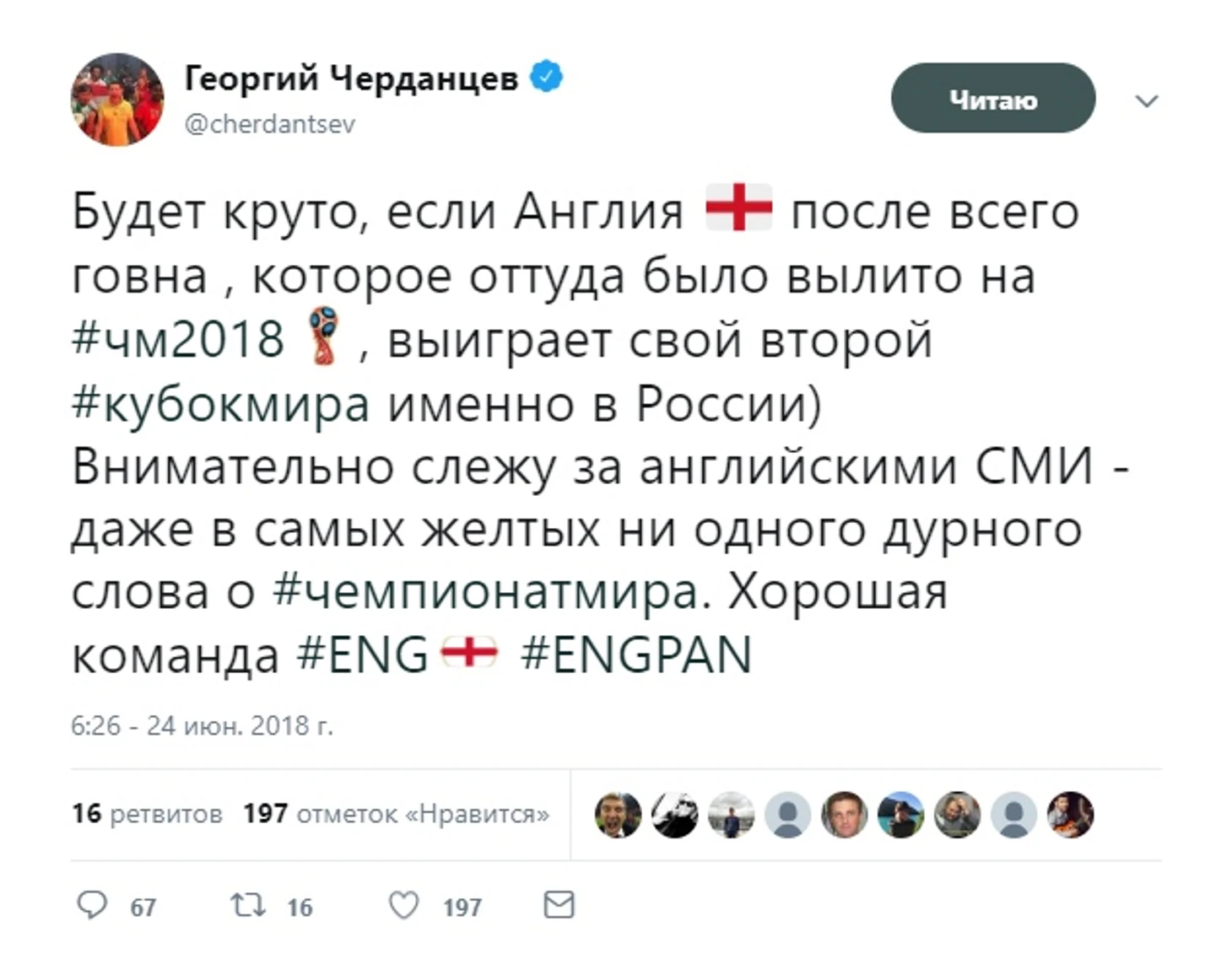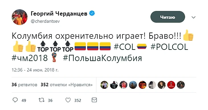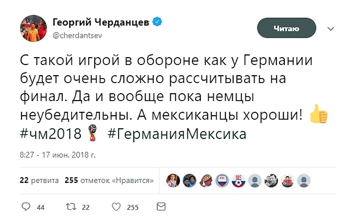 Что касается долгосрочных ставок - у нас есть и такие! Например, твиттер комментатора пестрит хвальбой в сторону англичан. Вычёркиваем Кейна и Компанию из списка возможных победителей ЧМ-2018! Положительные отзывы достались и сборной Колумбии. Вряд ли кто-то надеялся на её триумф, но если имеются оптимисты - извиняйте. С другой стороны, немцы и бразильцы, по мнению Георгия, не очень-то убедительны.