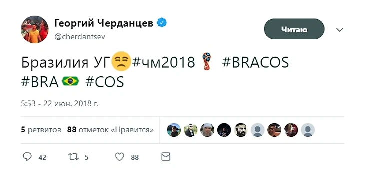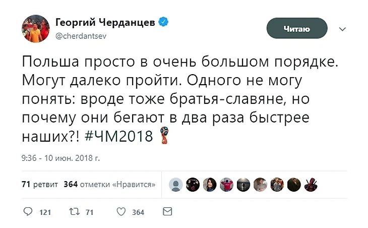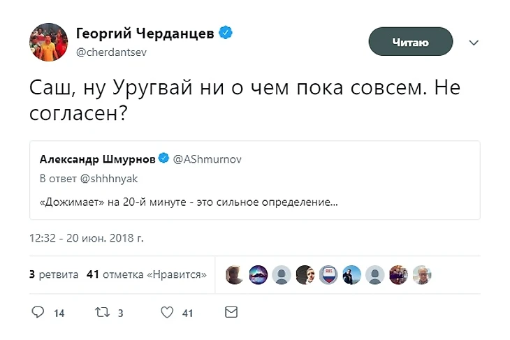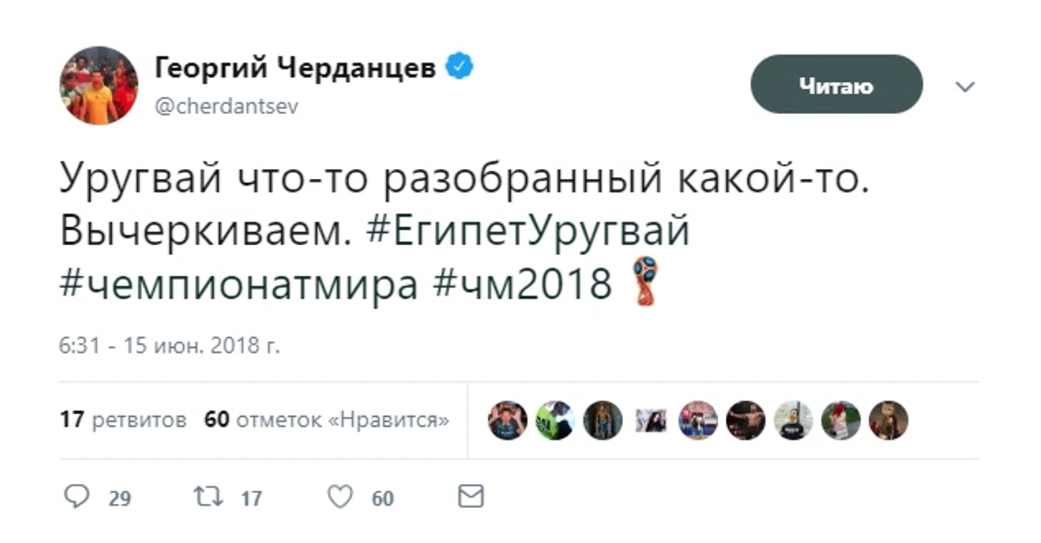 На дистанции Черданцев и вправду хорош, если ставить против его мнения. Чемпионат мира в России он начал успешно, прогнозировав успех поляков. Дальше - больше. Сегодня состоятся заключительные матчи группового этапа в группе А, которые решат какое место займёт сборная Россия. От этого зависит на кого наша сборная попадёт в 1/8 финала. Георгий усердно критиковал сборную Уругвая, с которой сегодня коллективу Черчесова придётся сразиться за 1 место в группе. Это очень грустно для нас!