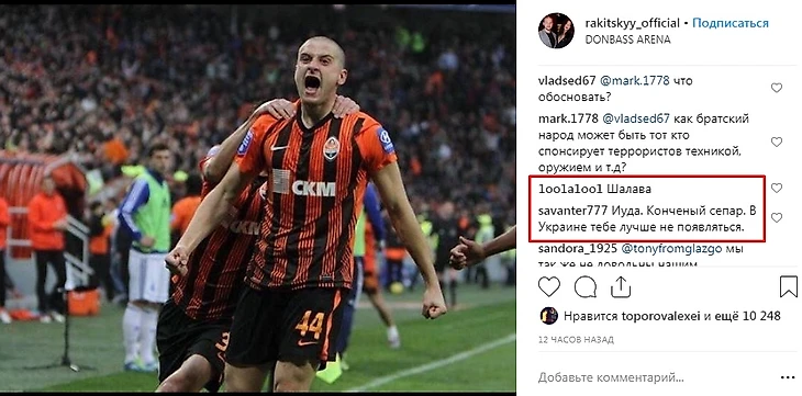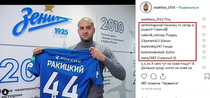 Защитник сборной Украины Ярослав Ракицкий подписал контракт с «Зенитом», перебравшись из Донецка в Санкт-Петербург. Фанаты его бывшего клуба «Шахтера» остались недовольны выбором одного из лидеров команды из-за политической ситуации между Украиной и Россией, заполнив социальные сети футболиста адской желчью.