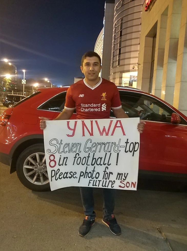 – Мы фанаты «Ливерпуля», но познакомились друг с другом только в Уфе, – улыбнулась девушка. У её ног лежал плакат с надписью на английском: «Стивен, мой муж хочет фото с тобой». Муж скромно сидел рядом. Эта пара приехала из Казани специально для того, чтобы сделать сэлфи с тренером «Глазго».