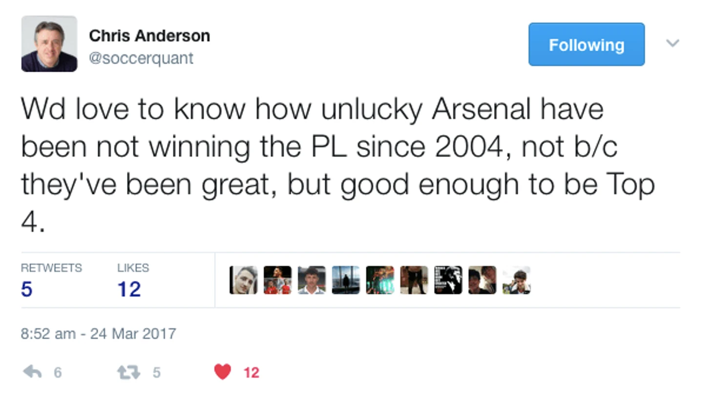 Если вы оказываетесь в четверке лучших на протяжении 12 сезонов подряд, каковы ваши шансы одержать победу хотя бы в одном из этих розыгрышей? Если кривая дисперсии смогла отклонится настолько, что “Лестер” пришел к чемпионскому титулу в одном из этих сезонов, то согласно теории вероятности, у “Арсенала” определенно были все шансы взять сразу несколько чемпионств. Именно такими мыслями на прошлой неделе поделился в твиттере Крис Андерсон, автор книги “Игра с числами”: