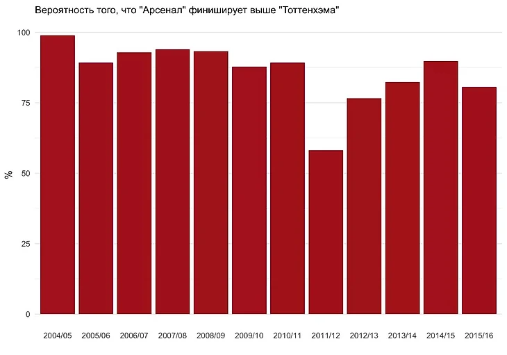 Хотя индивидуальные вероятности остаются крайне высокими, общая вероятность того, что "Арсенал" непременно финиширует выше "Тоттенхэма" в последних 12 сезонах, составляет всего 15%. Да, возможно, существуют факторы, которые здесь не учитываются. Однако, если вы считаете что прогнозу не хватает этих дополнительных факторов и он попросту не шпор-тивен, текущая ситуация со святым Тоттерингемом представляет собой маловероятное событие в любом случае.