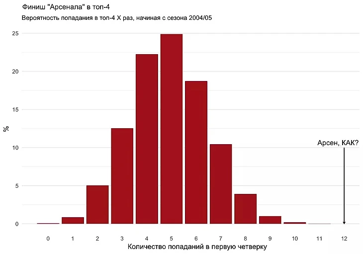 Точная оценка здесь: <1%. Когда число становится настолько маленьким, то трудно получить сколь-угодно содержательное объяснение данной ситуации. Возможно лишь предположить то, что даже в случае с клубом калибра “Арсенала”, ежегодное попадание в топ-4 крайне маловероятно и требует громадного сочетания как удачи, так и мастерства. Еще более удивителен тот факт, что данная ситуация менее вероятна, чем потенциальные 6 из 12 чемпионских сезонов.