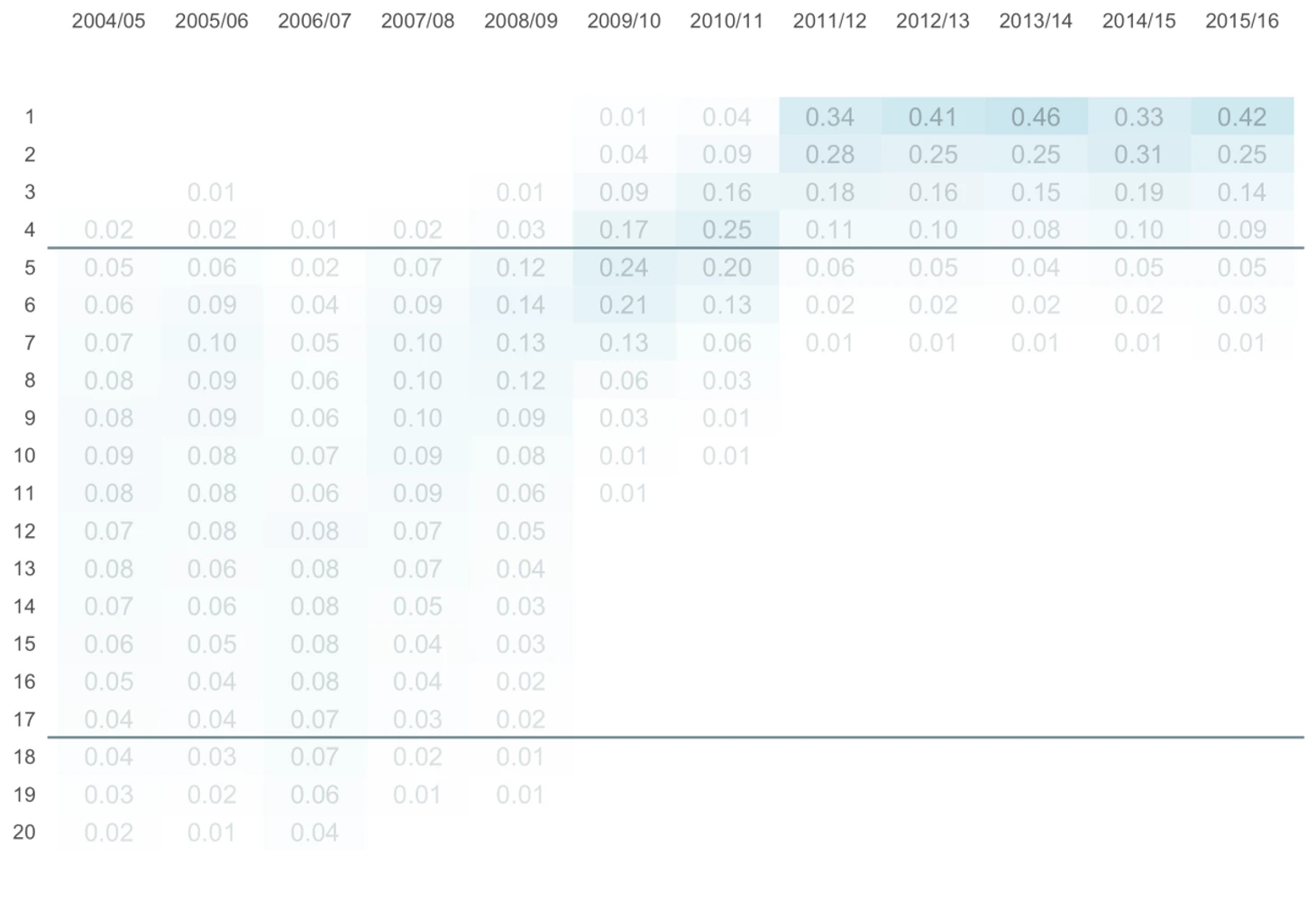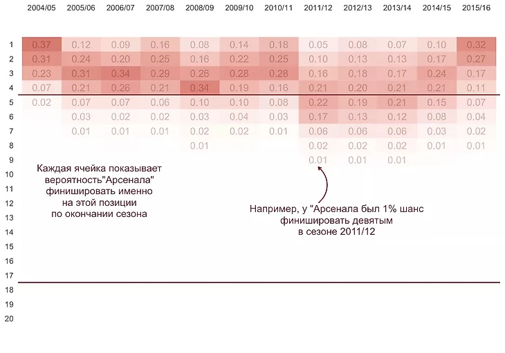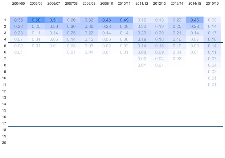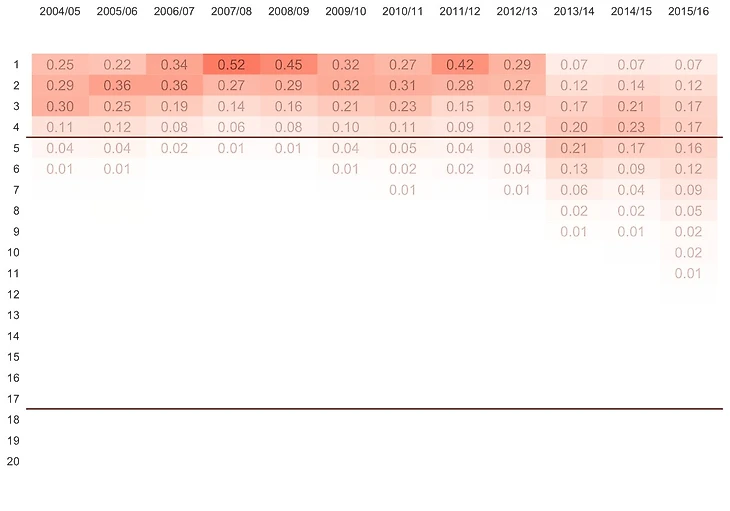 Давайте-ка абстрагируемся от предыдущих графиков и взглянем на вероятность финальной позиции команд АПЛ, начиная с сезона 2004/05.