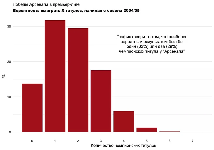 По методу описанному выше, вероятность того, что "Арсенал" выиграет 0 титулов в чемпионатах с 2004/05 по 2015/16 (включительно), оценивается в 14%. С таким грубым подходу к моделированию, возможно, не очень разумно ожидать каких-то чрезвычайно точных чисел. Тем не менее, это наводит на мысль о том, что "Арсеналу" несколько не везло в последних 12 сезонах.