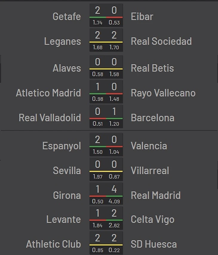 Хетафе – Эйбар. 2:0. В игре было не очень много моментов. Свой первый гол Хетафе забил на 18-й минуте ударом из-за пределов штрафной (причём вокруг было 3 игрока соперника). А второй уже на 90-й минуте. Примечательно, что во втором голе всё началось с выноса вратаря, и атака заняла 4 паса с быстрым забеганием двух игроков. Ещё один неплохой момент у хозяев был на 93-й минуте. Эйбар же за всю игру нанёс 9 ударов, но не один из них не пришёлся в створ. Матч относительно негрубый – 3 ЖК (причём одна на 1-й минуте, вторая на 91-й). По углам 5:5, однако Хетафе подал двойную на 85-й и ещё одну сделал на последней секунде игры.