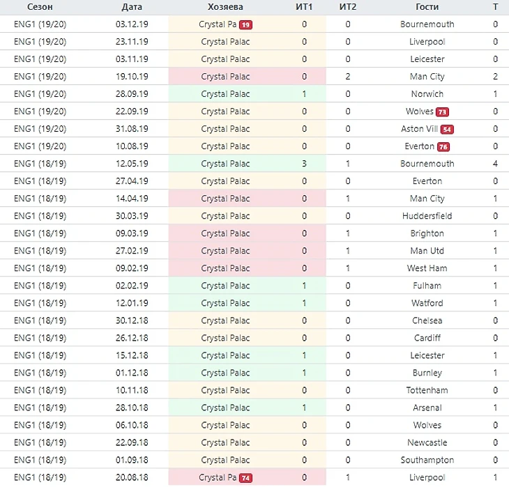 АПЛ. Кристал Пэлас. ТМ1 в 1 тайме в домашних (!) матчах. В текущем сезоне 7-1-1 (единственный ТБ был с Ман Сити - 0:2). С начала прошлого сезона 15-11-2.
