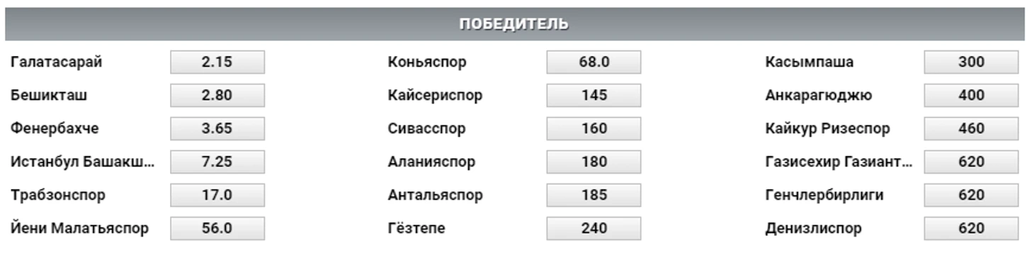 Как мы видим основные претенденты - это Галатасарай, Бешикташ и Фенербахче. Чуть поменьше котируются Истанбул и Трабзонспор. Все команды что после - это уже из разряда фантастики и сказок. Меньшие шансы на титул по мнению букмекеров имеют команды, только вышедшие в элитный дивизион. А теперь обо всех по порядку.