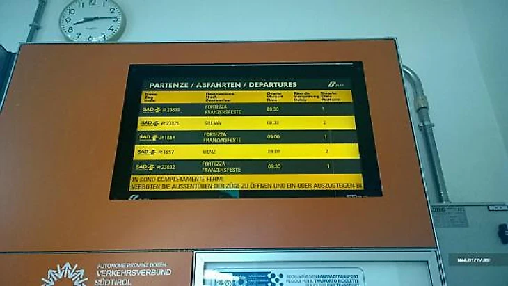 Расскажу так же немного о поездах. Вдруг кто то как я )) в гордом одиночестве и со средним английским )) там нет касс в принципе. Стоят автоматы по продаже. Спецом сфотографировала, чтобы вам ориентироваться. Для начала выбираете язык. Затем нажимаете на Single ticket для покупки одного билета в одну сторону (можно туда обратно, но я не была уверена вернусь ли сразу домой или меня может понести куда то. поэтому брала одиночные), затем выбираете региональный поезд, появляется меню с ближними городками (ну или самыми популярными направлениями), если же вашего города нет выбираете other и появляется экран с цифрами вам нужно выбрать код города, если вы его не знаете нажимаете 00 вы выскакивает меню далее "комплит" и выскакивает список с городами и рядом коды. Находите свой и вводите. Вот и вся премудрость. Цены на все направления разные, т.к. зависят от километража. Например Оланг-Виллабасса 2 евро, Виллабасса-Тоблах (и Сан Кандидо) - 1.5 евро, Тоблах-Оланг - 3 евро. Сан-Кандидо-Брунико - 10 евро. Не забывайте валидировать в синеньких валидаторах, они есть как на станции так и в переходах между путями. Признаться я частенько себя одергивала, чтобы не забыть. Проверяющие ходят, но лично у меня за всю поездку проверяли билеты только в регионалке и туда и обратно от Фортеццы до Вероны (и бесполезно притворятся спящими, лично меня трясли оба раза, приходилось с сонными глазами ковыряться в телефоне искать адобе версию, т.к. я не делала распечатку на бумаге). Что в местных электричках, что в фреччиабьянке никто ко мне не подходил и билет не спрашивал, однако я бы нарываться не советовала, штрафы там большие. Так же есть проездные на 1,3,7 дней, но я что то сразу не сориентировалась, а потом уже смысла не видела. На вокзалах есть комната ожидания со скамейками, нет необходимости мерзнуть на улице. Есть табло с ближайшими поездами, за две минуты по громкоговорителю объявляется прибытие поезда, так что вы успеете перейти на другую сторону, при условии, что вам надо садится не с той платформы где находится сам вокзал. Так же и в самих электричках остановки объявляются сильно заранее, так что не вскакивайте сразу как только объявят вашу станцию. Комната ожидания закрыта на ночь, учитывайте, т.к. я пришла (при отъезде в 5.31 утра) за 20-25 минут до поезда, пришлось стоять на улице, благо хоть было относительно тепло. На всех станциях туалеты, так же как и поездах. Причем я ни разу не видела когда их моют )) Для открытия дверей в электричке нужно нажать кнопочку как с улицы так и изнутри. Причем загорается та кнопка со стороны которой находится перрон. Кстати по поводу перрона, на номер пути тоже смотрите, например в Тоблах и из него я уезжала с одного пути, в Виллабассу со стороны Оланга я всегда приезжала на 2 путь, а уезжала с 1, однако ночью при отъезде путь был вторым. В любом случае на электричках всегда написано направление и конечная станция. Так что сориентируетесь, но все же будьте внимательными, чтобы не уехать в противоположную сторону.