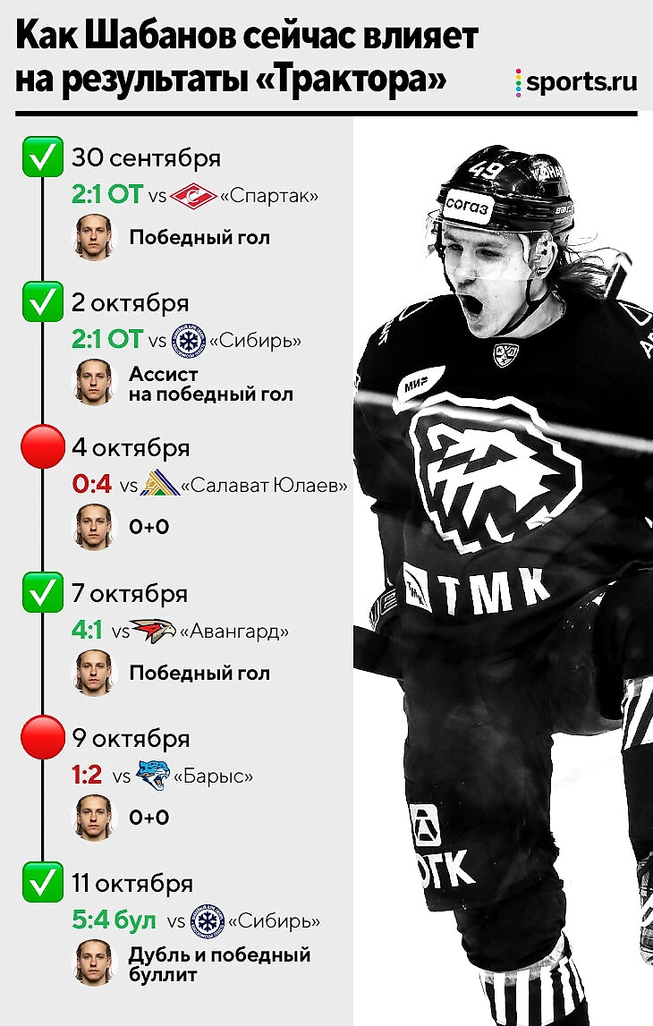 Если расширить календарь до семи матчей, Шабанов набрал в них 6 очков. Ассист в игре против «Салавата» (3:5) победным не стал. За 11 матчей до этого Максим имел лишь гол и передачу. Прошлый сезон стал первым полноценным в карьере Шабанова на профессиональном уровне. Там он поучаствовал в 67 матчах, забил 18 голов и сделал 13 ассистов. «Трактор» не попал в плей-офф.