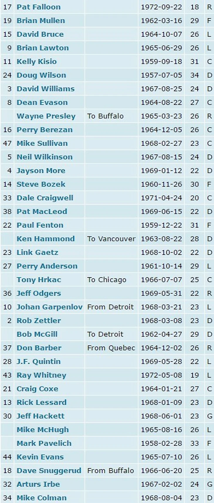 Ну что же, 3-го октября 1991 начался 75-й сезон НХЛ. Период, когда были дивизионы Норриса, Смайта, Адамса, и Патрика. Акулы располагались в дивизионе Смайта, вместе с Ванкувером, Эдмонтоном, Калгари, Виннипегом, и Лос-Анджелесом.