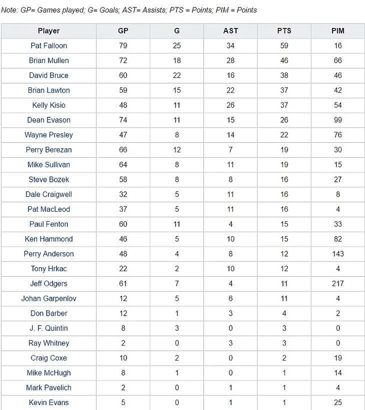 Стоит отметить Пэта Фаллуна, который набрал 59 (25+34) очков, и Дага Уилсона (да, да, именно того), который стал первым капитом Сан-Хосе в истории клуба.