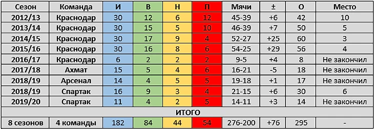 Олег Георгиевич Кононов - безусловно, неплохой тренер, к которому в последнее время, к сожалению, привязалось достаточно обидное прозвище "пиджак". Наибольшую известность Олег Георгиевич получил, благодаря своей трёхлетней работе в амбициозном проекте под названием Футбольный Клуб "Краснодар". Именно здесь он зарекомендовал себя как отличный тренер для команд среднего класса. После ухода из "Краснодара" у Кононова была неудачная попытка вернуться через "Ахмат" и неплохая командировка в тульский "Арсенал", которая предшествовала назначению в московский "Спартак". Вот сводная таблица всех сезонов Кононова во главе клубов РПЛ: