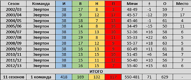 Дэвид Мойес 11 лет (2002-2013) работал главным тренером вечного середняка английского футбола - ливерпульского "Эвертона". Команда, не хватавшая с небес ни звёзд, ни медалей АПЛ, всегда считалась одним из фаворитов в борьбе за еврокубковые места. Вот сводная таблица всех сезонов Мойеса в АПЛ во главе "Эвертона":