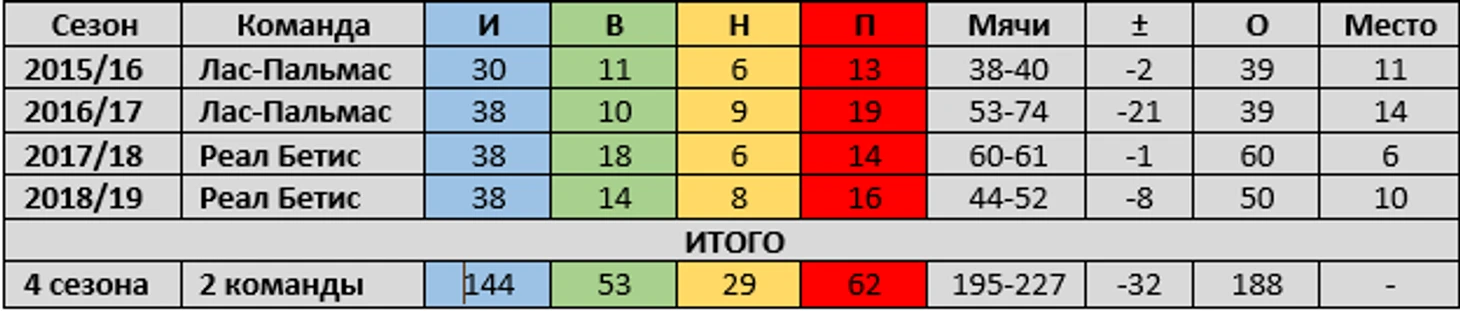 Кике Сетьену - 61 год, но, несмотря на возраст, за своими плечами он имеет всего 4 сезона в качестве главного тренера клубов Ла Лиги. С 2015 (с 9 тура Примеры) по 2017 год он работал в "Лас-Пальмасе", а с 2017 по 2019 - в "Реал Бетисе". Его высшим достижением является 6 место с "Бетисом" в сезоне 2017/18 и 1/16 Лиги Европы в прошлом сезоне, где клуб в упорной борьбе проиграл "Ренну" (общ. 4:6). Безусловно, испанец обладает хорошими тренерскими способностями и особенно славится своим умением выжимать максимум из команд со скромным бюджетом. Вот сводная таблица всех сезонов Кике Сетьена в Ла Лиге: