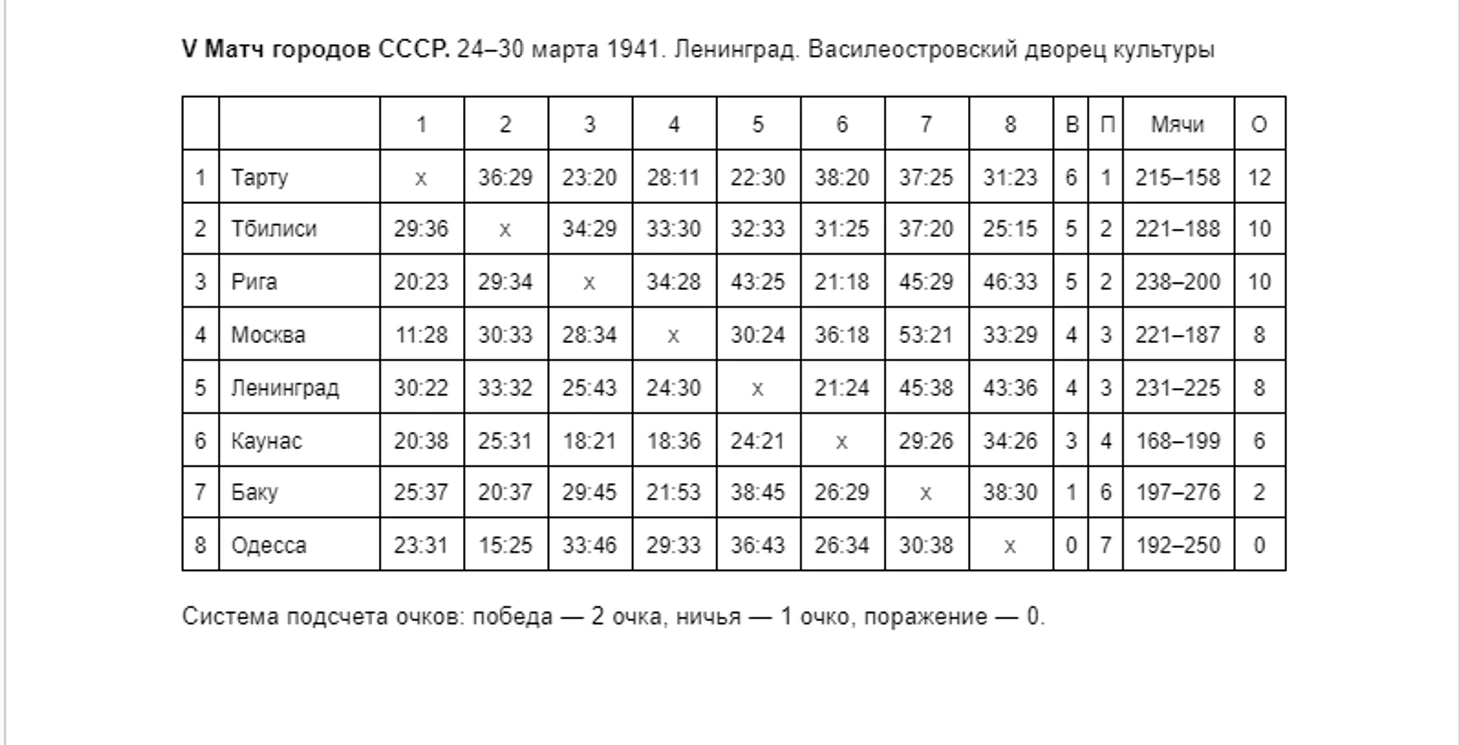 «Лучшие команды стран Балтии играли под названиями городов. Для определения города, который будет представлять Эстонию, был проведен тестовый матч Таллин – Тарту. Победа со счетом 37:28 дала право команде Тарту выступать в Ленинграде собственными силами.