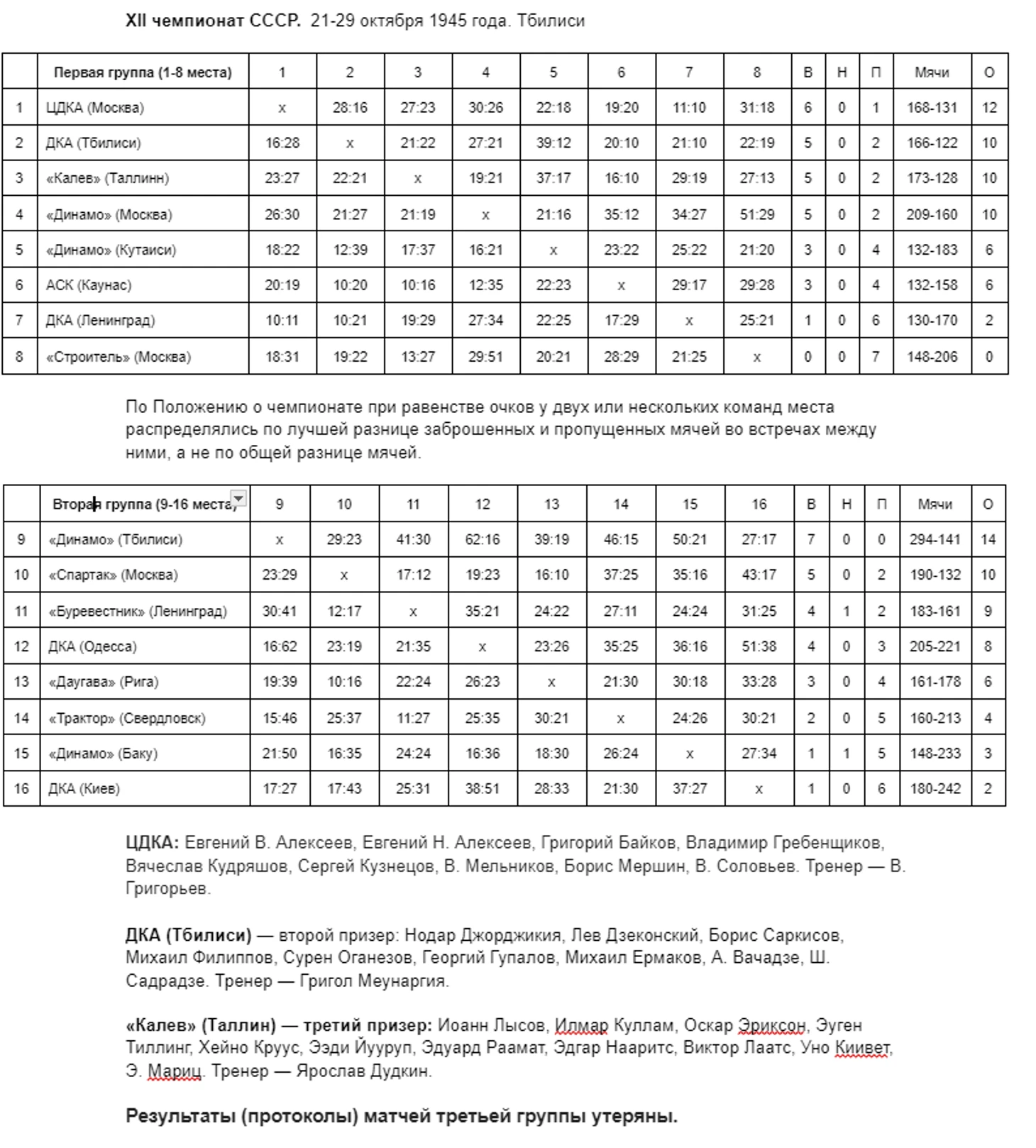 Непонятно, по какому принципу Всесоюзной секцией баскетбола были сформированы первая (за 1-8-е места) и вторая (за 9-16-е места) группы XII ЧЕМПИОНАТА СССР. Почему команды Литвы и Эстонии оказались в первой, а латвийская – во второй? Почему шестой («Динамо» Тб) и седьмой («Спартак» М) клубы прошлого года сейчас боролись только за 9-е место, а ЦДКА и ленинградский ДКА сразу отправились в высшую лигу? И куда исчез бронзовый призер-1944 московский «Локомотив»?