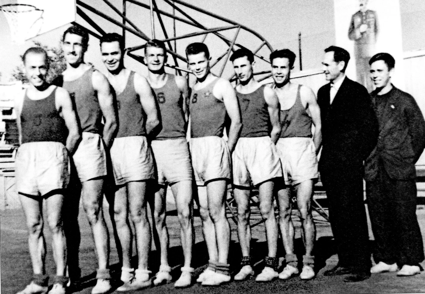 23 апреля 1945. Каунас. Сборные Москвы, победители Матча городов (слева направо): верхний ряд – тренер мужской команды Сергей Беляев, Анатолий Конев, Сергей Тарасов, Юрий Ушаков, Василий Колпаков, Борис Егоров, Алексей Лобанов, Евгений Н.Алексеев, Владимир Гребенщиков, тренер женской команды и игрок мужской команды Константин Травин. Нижний ряд – женская сборная Москвы