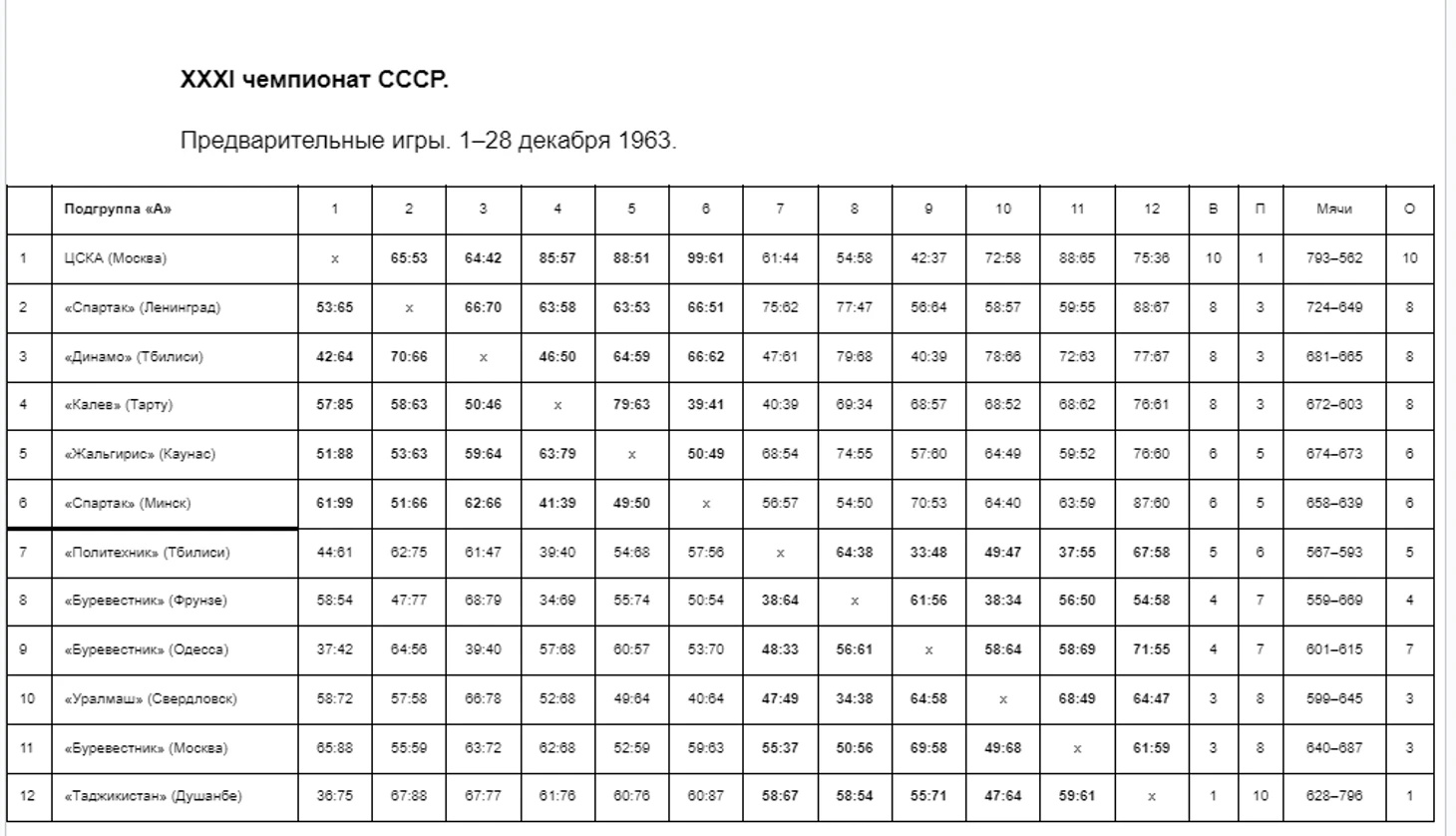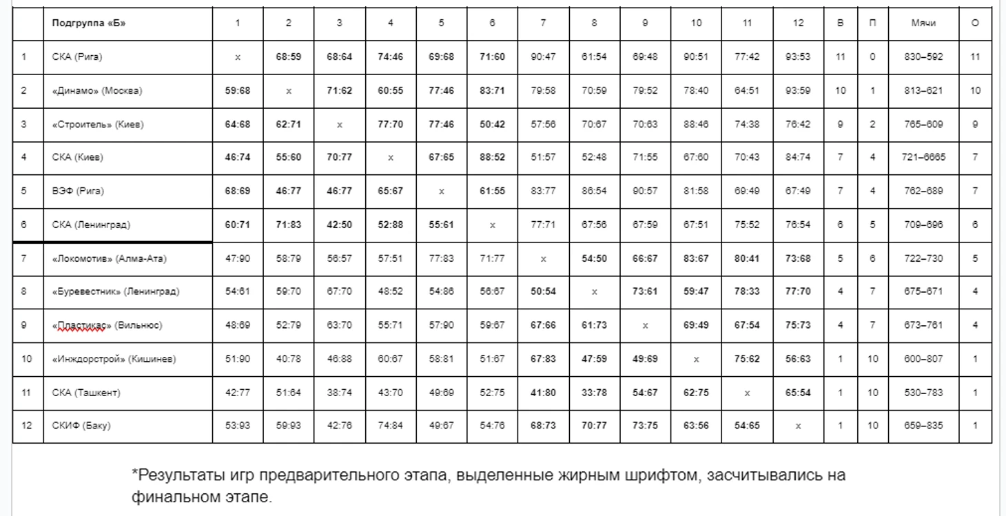 А пока из первой группы (Гомель, Каунас, Дубна) в большой финал вышли: ЦСКА – зачетные баллы 5-0 (всего 10-1), ленинградский «Спартак», тбилисское «Динамо» – 3-2 (8-3), «Калев» (Тарту) – 2-3 (8-3), «Жальгирис», минский «Спартак» – 1-4 (6-5). Из второй группы (Ленинград, Алма-Ата, Рига): рижский СКА – 5-0 (11-0), московское «Динамо» – 4-1 (10-1), киевский «Строитель» – 3-2 (9-2), киевский СКА – 2-3 (7-4), ВЭФ – 1-4 (7-4), ленинградский СКА – 0-5 (6-5). В обеих группах обошлось без сенсаций.