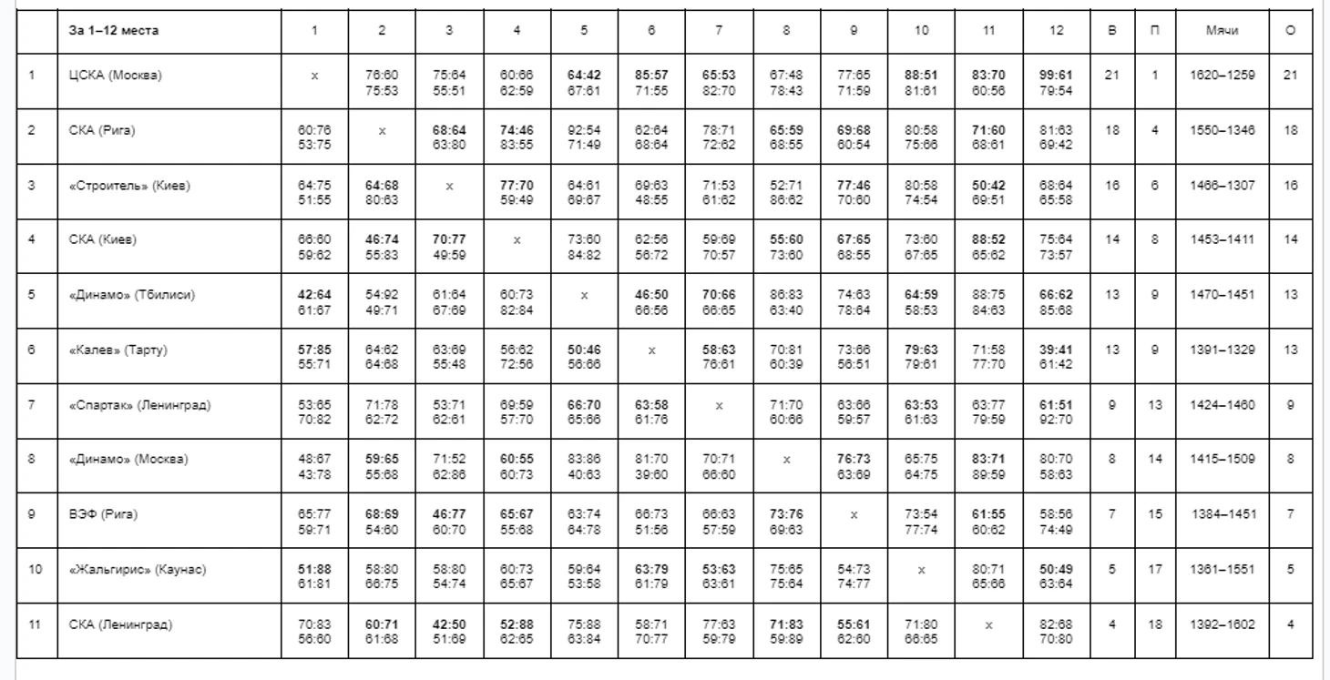 После 11 матчей: ЦСКА – 10 побед, СКА Р – 9, «Строитель» – 8, СКА К – 7, «Динамо» Тб, «Динамо» М – 6, «Спартак» Л, «Калев» – 5, ВЭФ – 4, «Жальгирис» – 3, СКА Л – 2, «Спартак» Мн – 1.