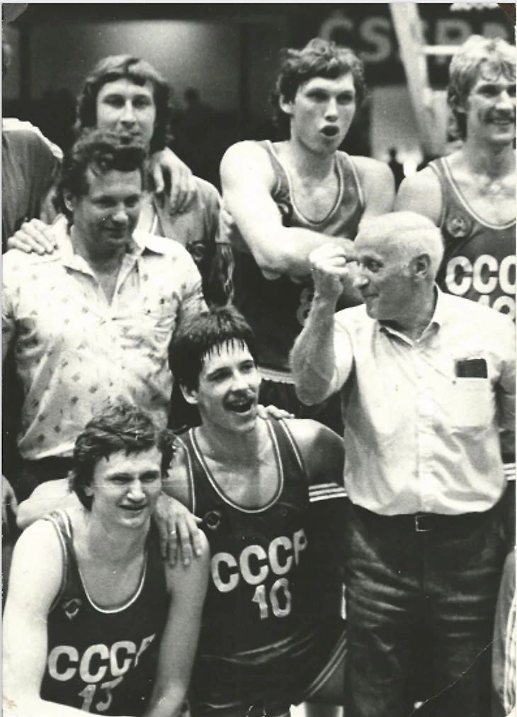 Сборная СССР – чемпион Европы. Слева направо и сверху вниз: Николай Фесенко, Андрей Лопатов, Анатолий Мышкин, врач Виталий Карчевский, Сергеюс Йовайша, Валдис Валтерс и главный тренер Александр Гомельский