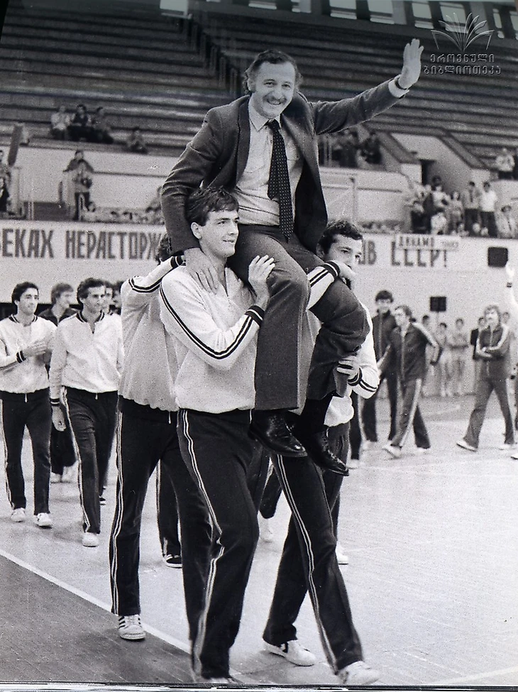 27 сентября 1981. Тбилиси. Михаил Коркия на плечах у Николая Дерюгина и его партнеров совершает круг почета во время праздничной церемонии расставания с большим спортом