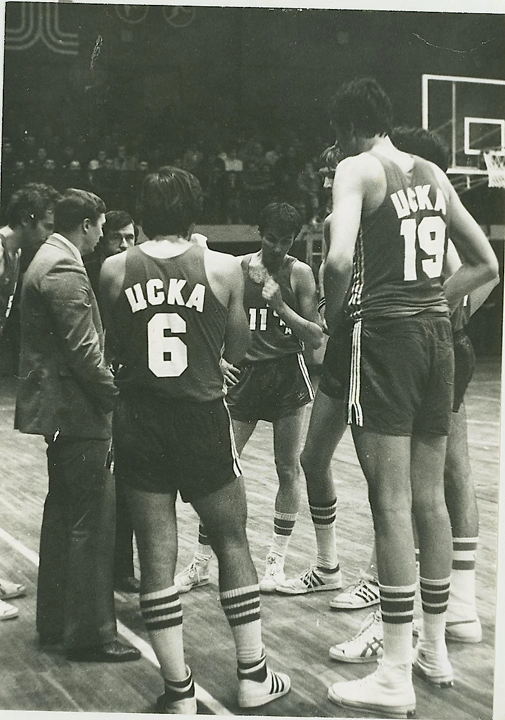 Январь 1981. ЦСКА – лидер чемпионата страны. Тайм-аут главного тренера Юрия Селихова (второй слева). Вокруг него (по часовой стрелке): Александр Гусев, массажист Аскер Барчо, Александр Мелешкин, Анатолий Мышкин, Сергей Тараканов, Виктор Панкрашкин (№ 19), Валерий Милосердов (№ 6)