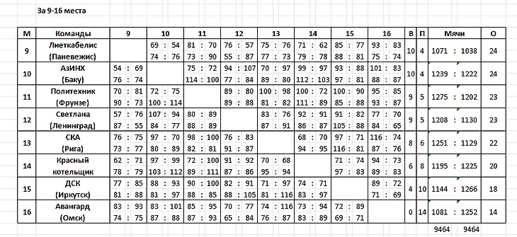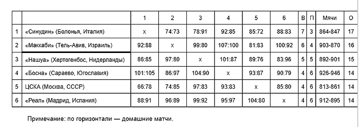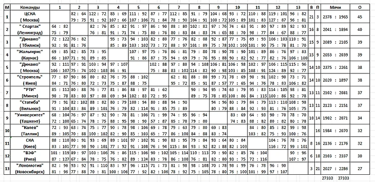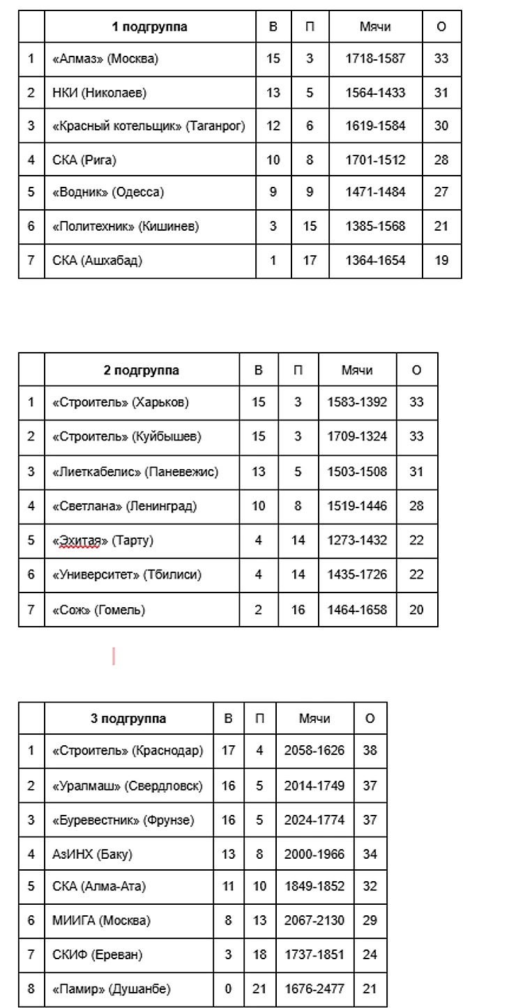 Итоги двухкругового турнира (у всех по 24 матча): ЦСКА – 21-3, «Спартак» – 16-8, «Динамо» Тб, «Жальгирис» – 15-9, «Динамо» М, «Строитель» – 14-10 (этим командам предстояло разыгрывать медали), РТИ, «Статиба» – 13-11, «Университет» – 10-14, «Калев», СКА К – 8-16, ВЭФ – 6-18, «Локомотив» – 3-21.