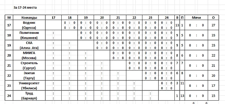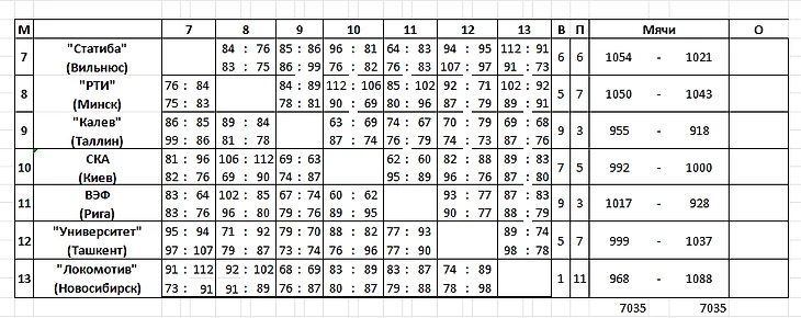 …После турнира в Риге положение команд нижней семерки было таким: РТИ, «Статиба» – 16 побед, «Университет» – 14, «Калев» – 12, СКА -11, ВЭФ – 10, «Локомотив» – 3.