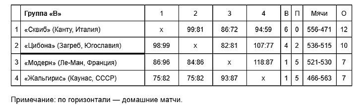 Теперь в декабре для трех наших клубов начались испытания куда серьезнее. Сразу стоит сказать, что клуб из Каунаса оказался не готов к борьбе на высоком уровне. В четвертьфинальной группе «Жальгирис» оба раза проиграл итальянскому «Сквибу», югославской «Цибоне», обменялся победами с французским «Модерном» и занял последнее место.