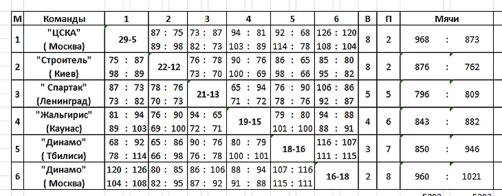 На следующий день «Спартак» воспользовался праздничным настроением ЦСКА – 87:73. Это была третья победа ленинградцев в Тбилиси, также по три одержали хозяева и «Строитель», где в полную силу при поддержке Рыжова заиграл дуэт центровых Белостенный-Ткаченко. «Жальгирис» притормозил – всего две победы.