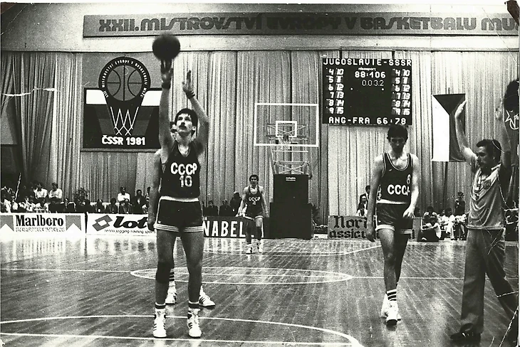 30 мая 1981. Гавиржов. Последние секунды матча Югославия – СССР. Сейчас лучший, по мнению журналистов, игрок чемпионата Европы Валдис Валтерс реализует оба штрафных броска, и счет станет 88:108. № 4 – Станислав Еремин, № 6 – Сергей Тараканов, по итогам чемпионата Европы получивший приз «Лучший по реализации штрафных бросков»