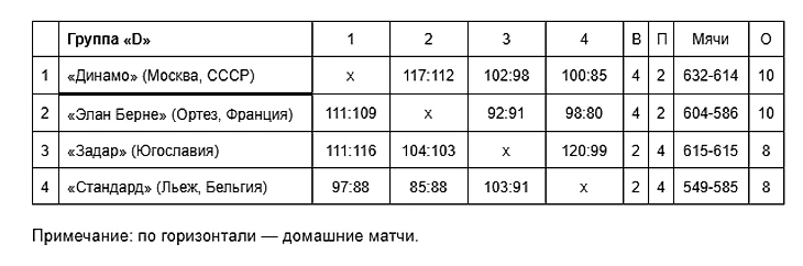 А вот московское «Динамо» четвертьфинальный турнир X РОЗЫГРЫША КУБКА КОРАЧА выиграло в своем стиле «шашки наголо»: досрочно, за тур до окончания, обеспечило себе первое место в группе, сыграв пять матчей (4-1) со средним счетом – 108,4:103,4. Динамовцы опередили (по личным встречам) французский «Элан Берне» (109:111 и 117:112), югославский «Задар» (114:111 и 102:98) и бельгийский «Стандард» (100:85). Последний матч, в Льеже (88:97) уже значения не имел.