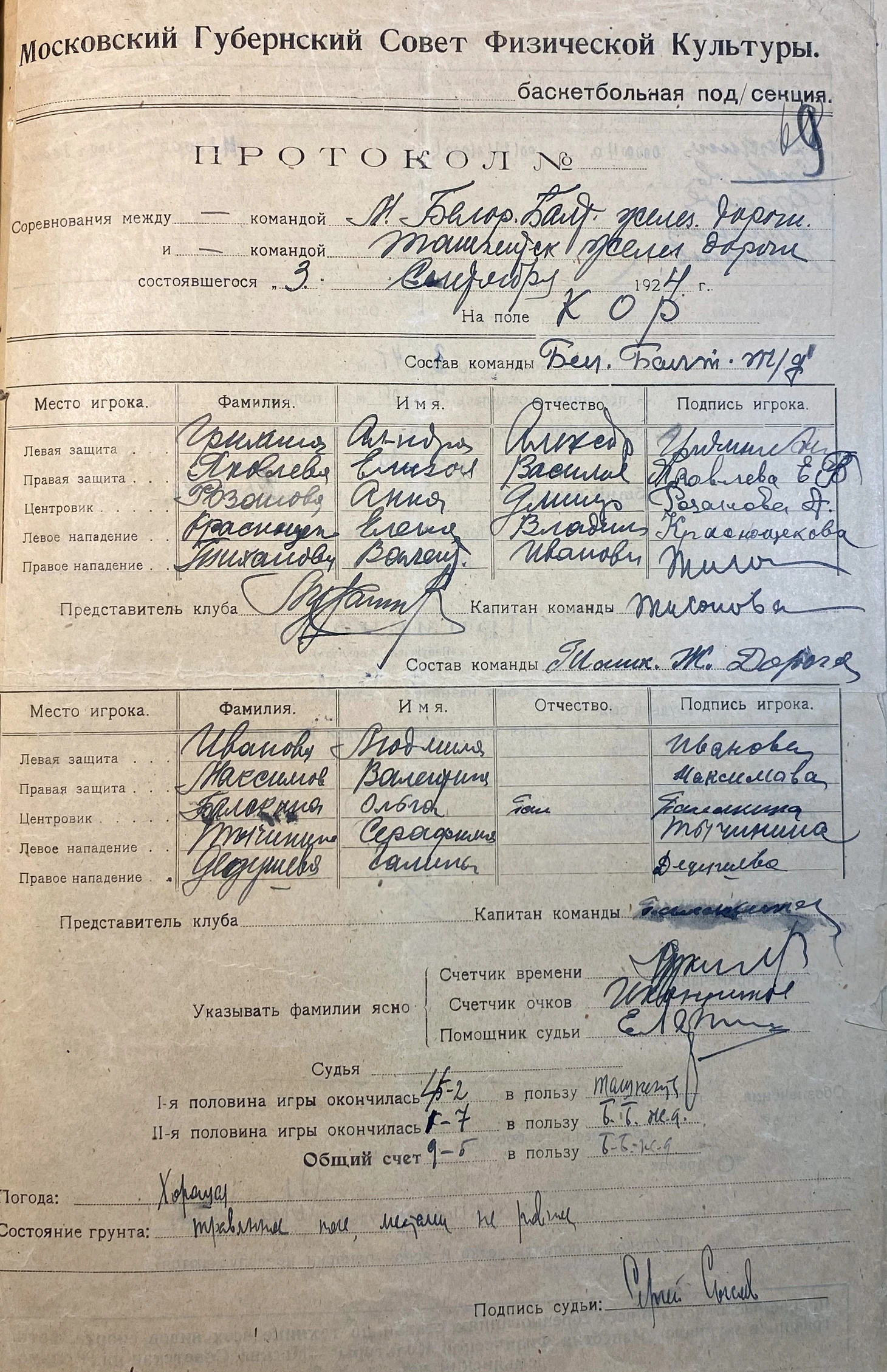 «Баскетболом в Москве ведает подсекция баскетбола секции игр МСФК. Председателем ее состоит С. В. Сысоев, секретарем т. Рицнер и членами тт. Маркушевич и Гиммельфарб. Коллегию судей возглавляет М. Б. Ромм, заместителем его является т. Карева и секретари тт. Казанский и Фельдман».