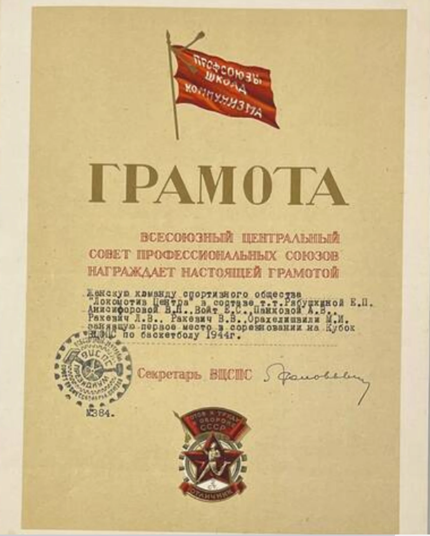 1944. Грамота, врученная женской команде «Локомотив» (в данном контексте — «Локомотив Центру») — обладателю Кубка ВЦСПС