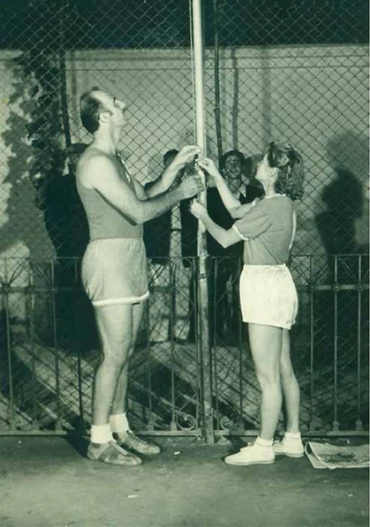 1950. Вильнюс. Капитаны команд-чемпионов Евгения Зарковская («Динамо» Москва) и Отар Коркия («Динамо» Тбилиси) опускают флаг на закрытии первенства СССР