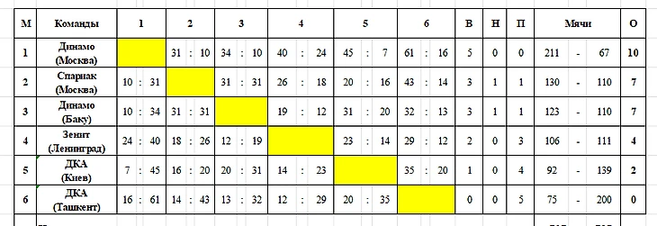 Итоговая классификация VI чемпионата СССР. 1. «Динамо» (Москва). 2. «Локомотив» (Москва). 3. «Спартак» (Москва). 4. «Трактор» (Свердловск). 5. «Динамо» (Баку). 6. ДКА (Тбилиси). 7. «Зенит» (Ленинград). 8. «Буревестник» (Ленинград). 9. ДКА (Киев). 10. «Спартак» (Ростов-на-Дону). 11. ДКА (Ташкент). 12. «Спартак» (Новосибирск)