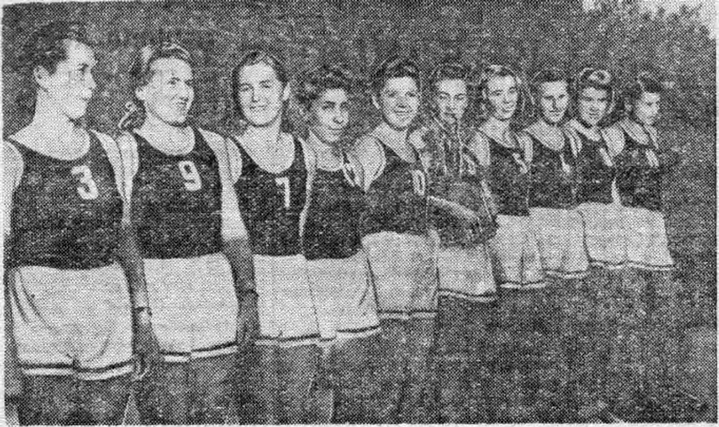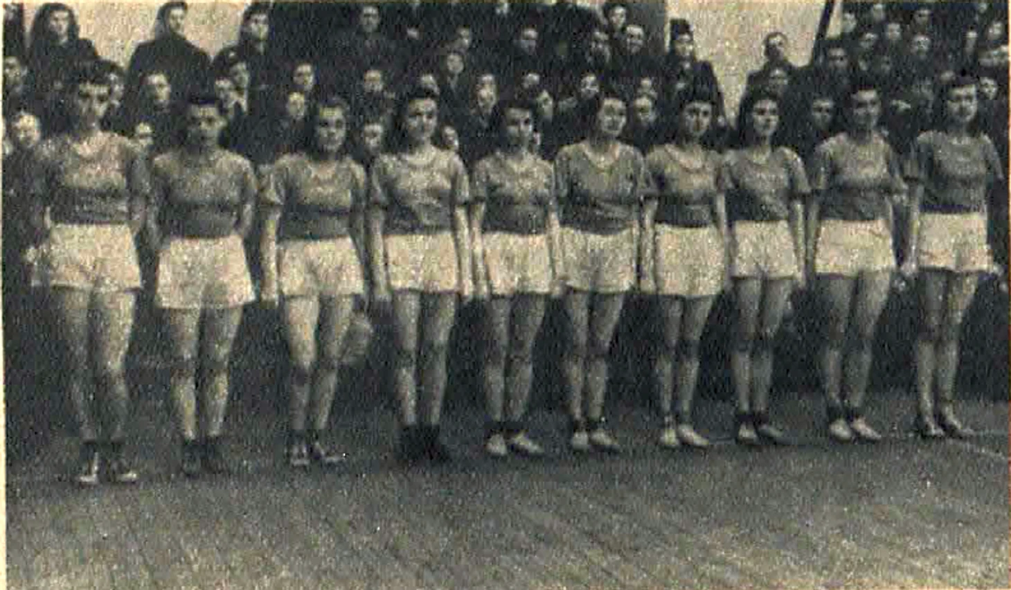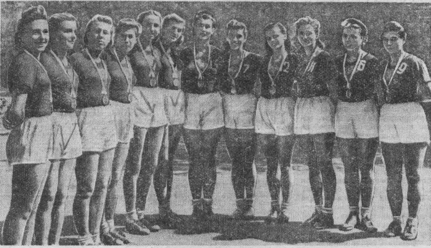 21 августа 1949. Будапешт, Венгрия. Сборная СССР — победитель X Всемирных студенческих игр. Слева направо: Вера Ерофеева, Нина Пименова, Евгения Анисимова, Евгения Зарковская, Нина Максимельянова, Нина Максимова, Тамара Моисеева, Лидия Алексеева, Скайдра Виноградова, Валентина Копылова, Людмила Зайцева и Вера Харитонова. На фото нет тренера Григория Румянцева