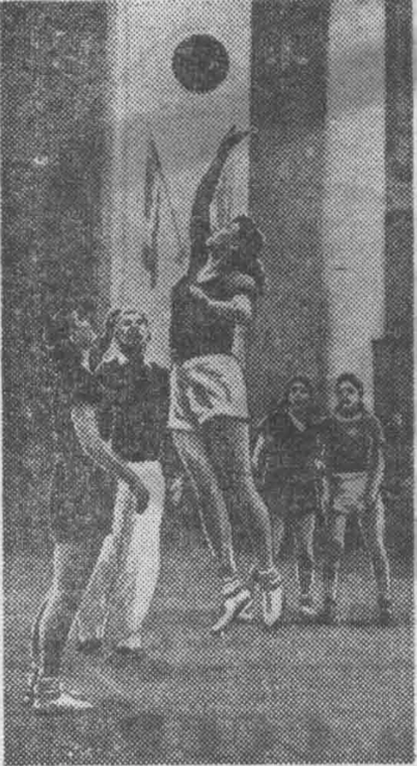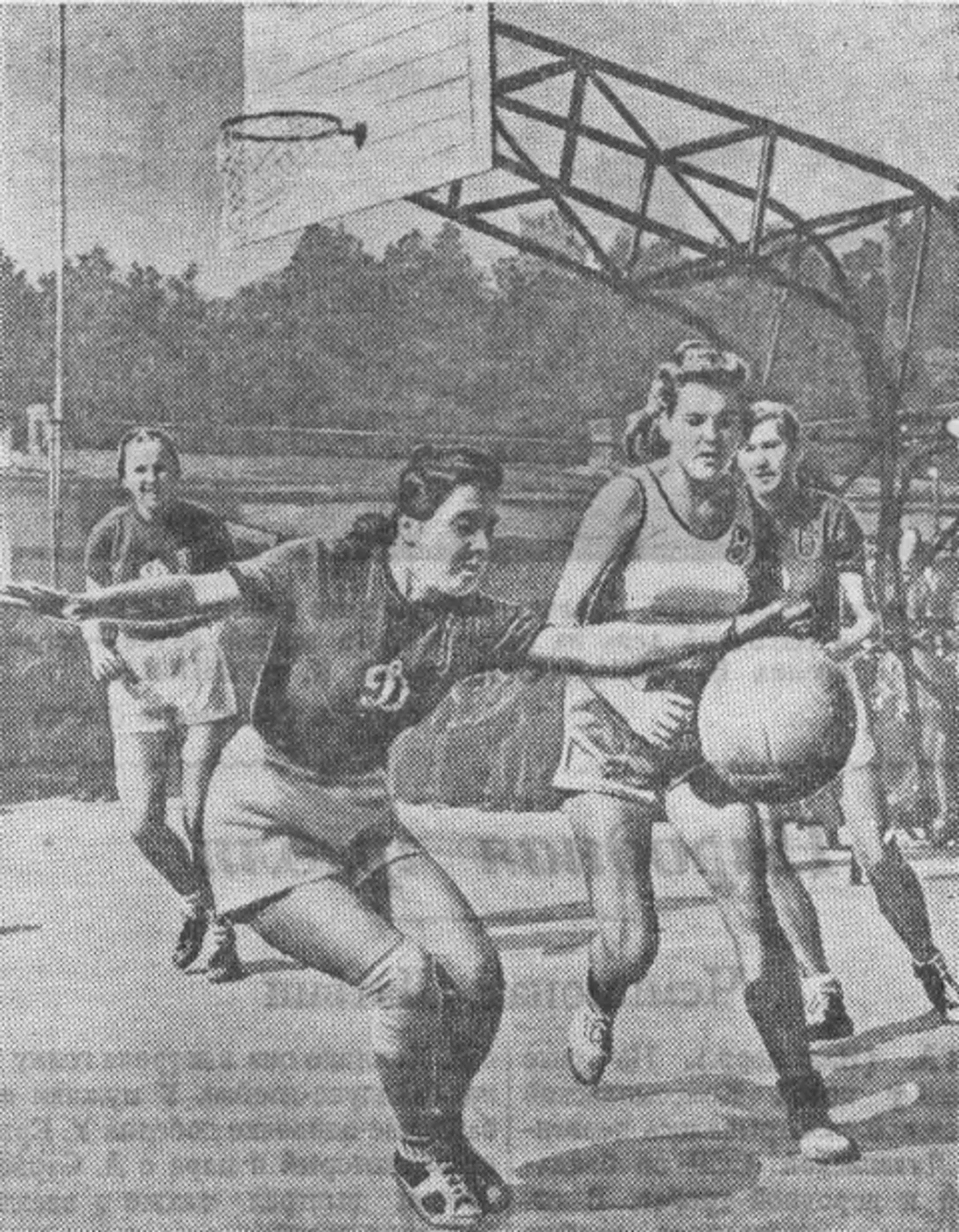 17 сентября 1949. Харьков. Матч XVI чемпионата СССР «Динамо» (Москва) — «Динамо» (Киев) — 36:29. Нина Максимельянова, Вера Харитоновa и Hина Максимова пресекают атакующий прорыв киевлянки 3ои Стасюк