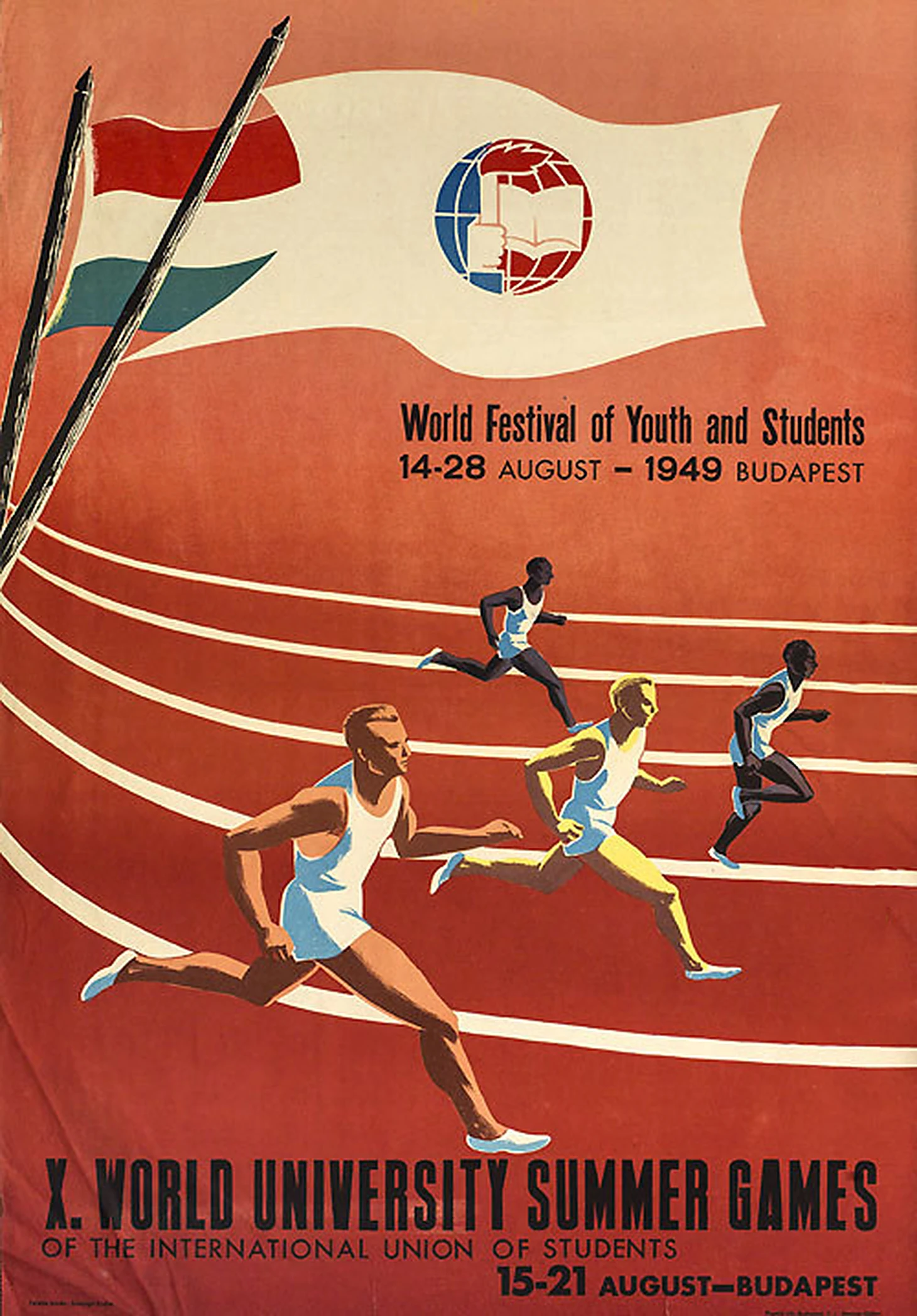 Будапешт, Венгрия. Плакат Х Всемирных студенческих игр (15–21 августа) и II Всемирного фестиваля молодежи и студентов (14–28 августа)