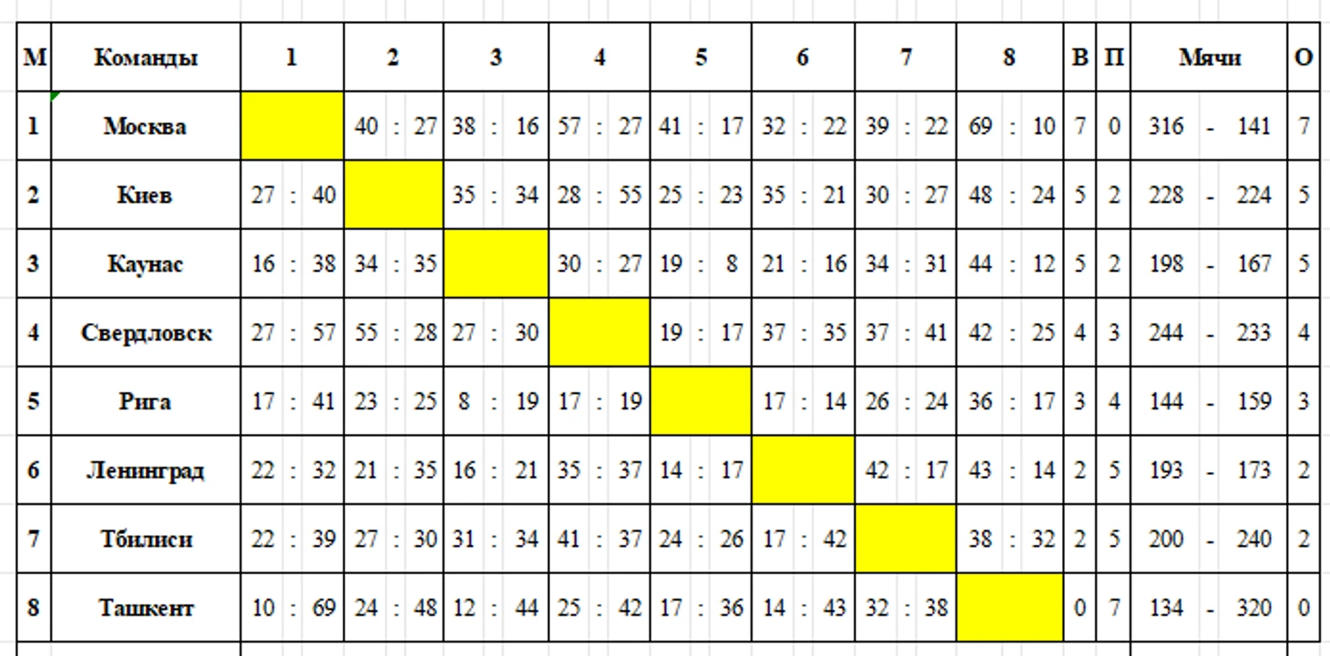 Сборная Свердловска, которая год назад была второй, разгромила представителей узбекской столицы, продемонстрировав сбалансированность состава и длину скамейки — 42:25. На следующий день уральцы обыграли и сборную Киева — 55:28.