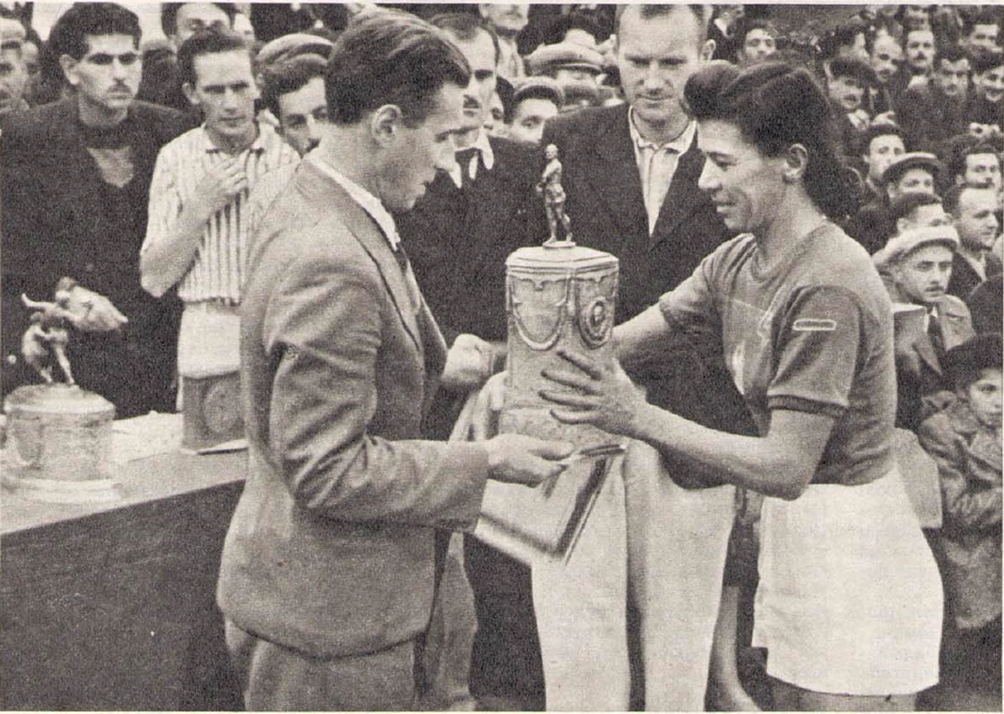 23 октября 1949 года. Тбилиси. Стадион в парке им. Кирова. Главный судья розыгрыша Кубка СССР Игорь Беляев вручает трофей капитану московского «Динамо» Вере Бессоновой