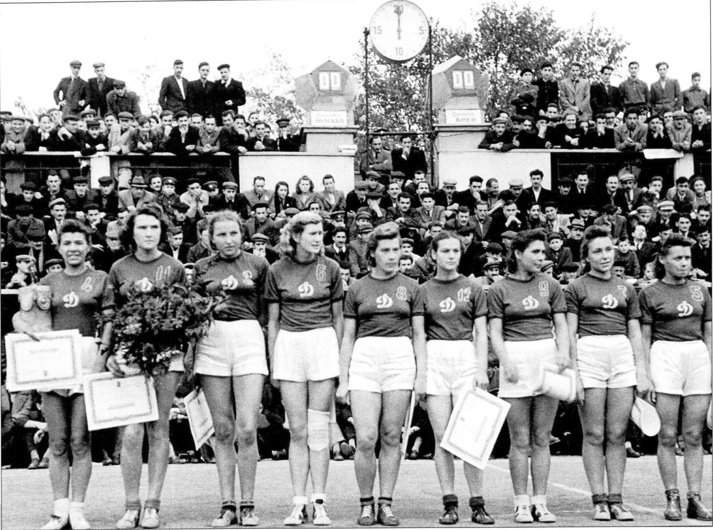 23 октября 1949. Тбилиси. Стадион в парке им. Кирова. Московское «Динамо» — обладатель Кубка СССР. Слева направо Вера Бессонова, Любовь Лобанова, Нина Максимельянова, Нина Максимова, Элла Мицис, Милица Жаркова, Вера Харитонова, Вера Ерофеева, Екатерина Мефодьева. На фото нет тренера Степана Спандарян