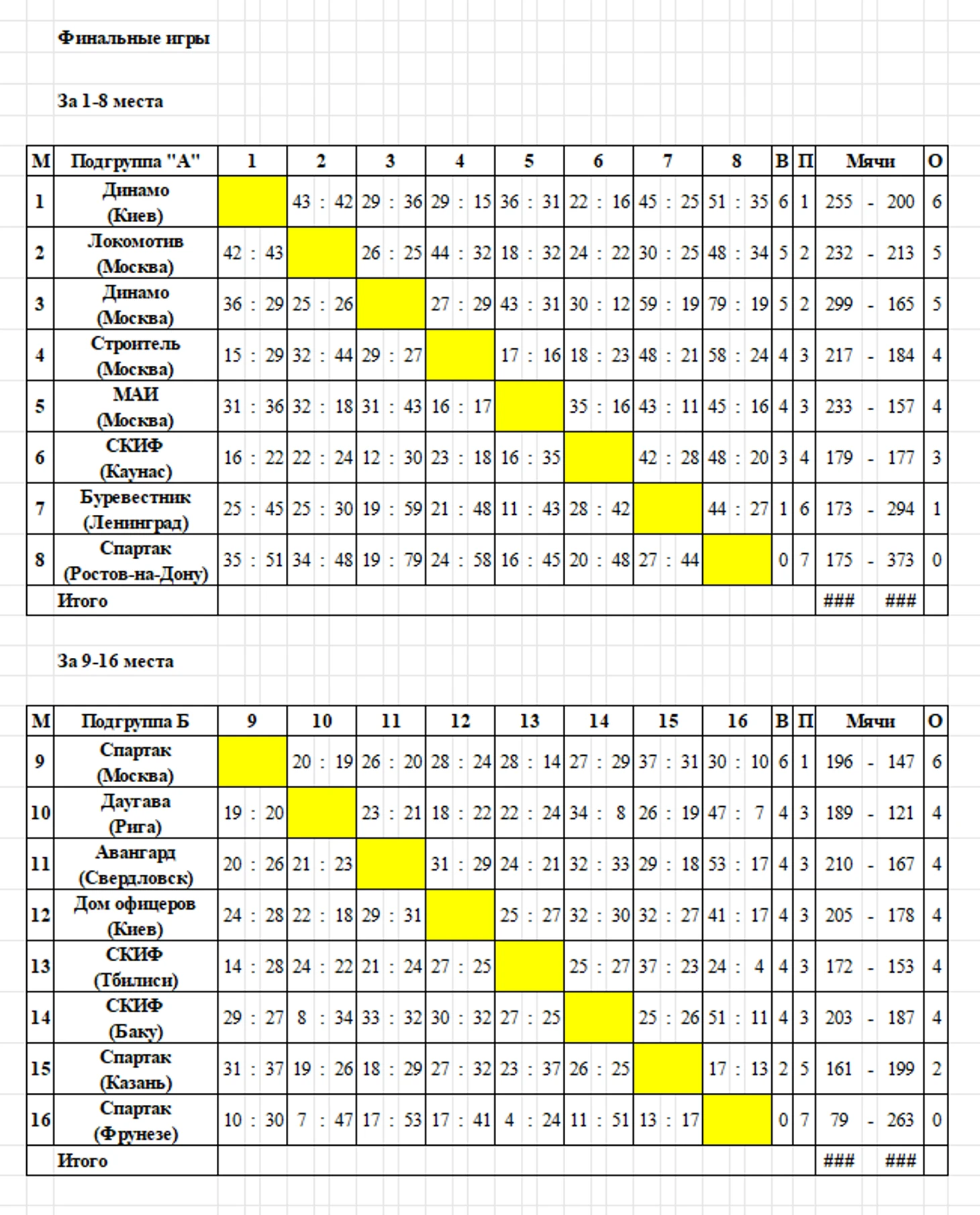 Итоговая классификация XVI чемпионата СССР. 1. «Динамо» (Киев). 2. «Локомотив» (Москва). 3. «Динамо» (Москва). 4. «Строитель» (Москва). 5. МАИ (Москва). 6. СКИФ (Каунас). 7. «Буревестник» (Ленинград). 8. «Спартак» (Ростов-на-Дону). 9. «Спартак» (Москва). 10. «Даугава» (Рига). 11. «Авангард» (Свердловск). 12. Дом офицеров (Киев). 13. СКИФ (Тбилиси). 14. СКИФ (Баку). 15. «Спартак» (Казань). 16. «Спартак» (Фрунзе). 17. «Динамо» (Харьков). 18. УСК (Тарту). 19. «Динамо» (Сталинабад). 20. «Динамо» (Ташкент). 21. «Большевик» (Минск). 22. «Спартак» (Ленинакан). 23. «Большевик» (Ашхабад). 24. «Большевик» (Кишинев).