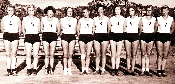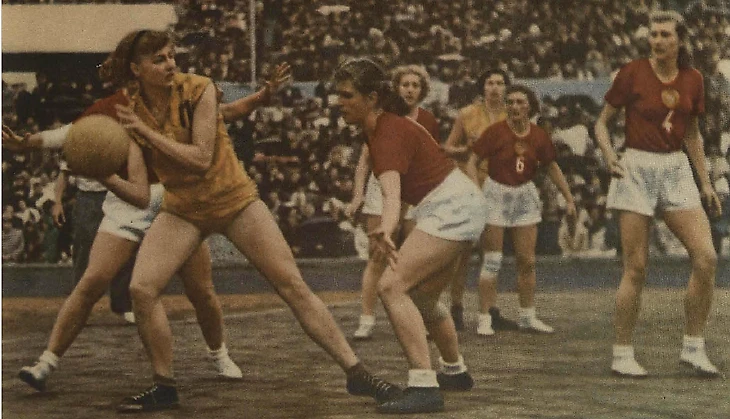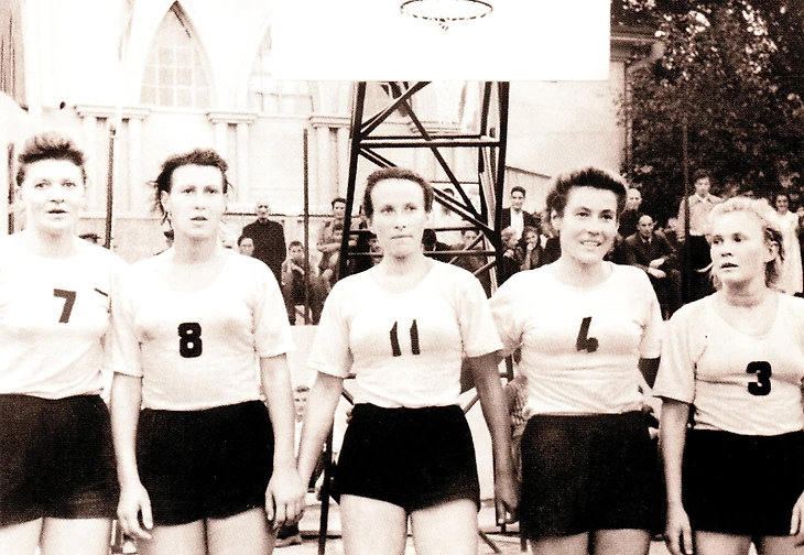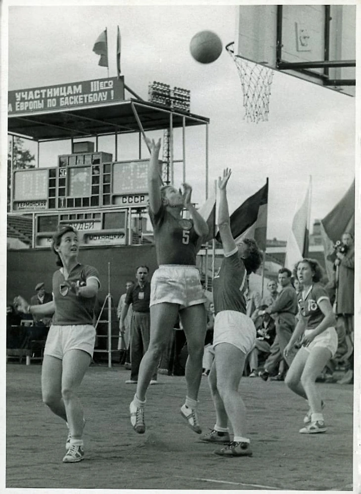 18 мая 1952. Москва. Стадион «Динамо». Матч III чемпионата Европы СССР — ГДР — 133:4. Раиса Маментьева (№ 5) станет самым результативным игроком, набрав 31 очко