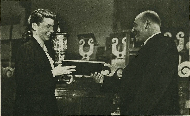 Май 1952. Москва. Капитан сборной СССР Лидия Алексеева получает приз за первое место на чемпионате Европы из рук председателя оргкомитета А. Васильева